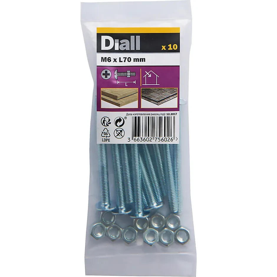 Les 10 écrous et boulons de couverture zingués de ce pack sont fabriqués à partir d’acier au carbone. Ils mesurent 70 mm de long et ont un diamètre M6. Ils sont idéaux pour tout un éventail de projets de bricolage.