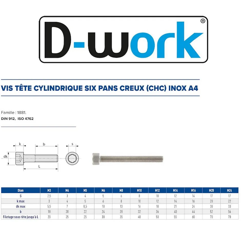 Présentation du produit : Découvrez notre lot de 10 vis CHC en Inox A4, idéales pour vos projets de construction et de bricolage. Ces vis sont conçues pour offrir une résistance optimale à la corrosion, garantissant ainsi une durabilité exceptionnelle dans le temps. Caractéristiques principales : : Type : Vis CHC Dimensions : 20 x 120 mm Matériau : Inox A4 Norme : DIN 912 Avantages : : Ces vis en Inox A4 sont non seulement résistantes à la corrosion, mais elles offrent également une excellente tenue dans le temps, ce qui les rend parfaites pour une utilisation en extérieur ou dans des environnements humides. Utilisation : : Pour une utilisation optimale, il est recommandé d’utiliser un tournevis adapté à la tête de la vis. Assurez-vous de pré-percer les matériaux durs pour éviter d’endommager la vis ou le matériau.