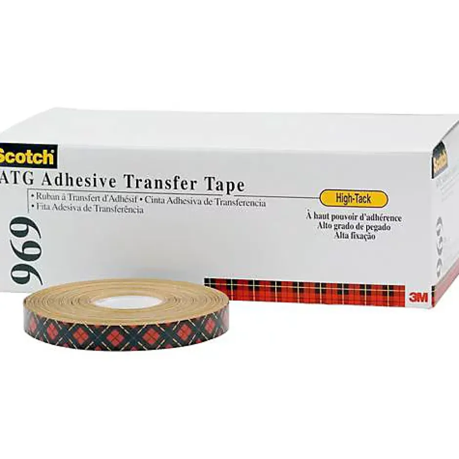 Film adhésif double face 3M ATG 969 transparent, 19 mm x 16,5 m, épaisseur 0,13 mm. Offre une adhérence instantanée très élevée sur surfaces légèrement rugueuses, bonne résistance au cisaillement, aux produits chimiques et aux UV, et tenue thermique jusqu’à +80 °C (brièvement +120 °C). Sans support, facile à appliquer avec système ATG, adapté aux matériaux à faible énergie comme PE et PP pour des collages durables et discrets.