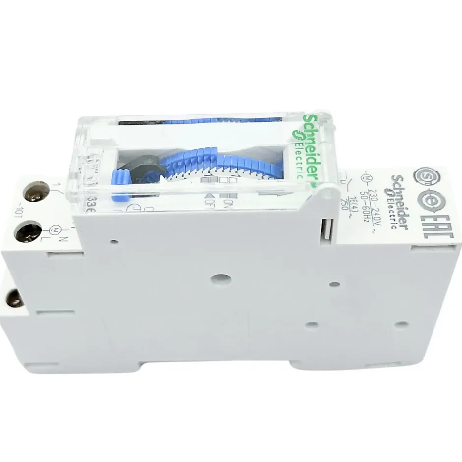 Horloge journalière avec réserve de marche – Schneider 15336Cet interrupteur horaire est fabriqué par Schneider, il est utilisé pour programmer le fonctionnement d’appareil sur une plage horaire de 24H sur 1 canal.Cet inter horaire automatique permet de commander 1 circuit distinct avec 1 programme distinct.La mise à l’heure ainsi que le changement d’heure été/hiver se font de façon manuel.L’avantage de l’interrupteur horaire analogique 15336 est sa programmation simple et rapide. Il vous suffit d’exercer une pression sur les segments de commutation (ergots bleus) aux horaires ou vous souhaitez activer le programme. Le disque de réglage central indique la période de commutation. La précision de la programmation est de l’ordre de +/- 1s par jour.L’horloge programmable 15336 doit être installée sur un circuit de tension 230Vca et d’intensité 16A. Bien que le constructeur préconise l’installation de l’interrupteur programmable pour une commutation jusque 16A, nous vous conseillons de le relayer par un contacteur modulaire pour augmenter la durée de vie des contacts.Les avantages de l’interrupteur programmable Schneider 15336 :96 commutationsActive et désactive automatiquement les charges selon le programmeIntervalle minimum de 15 minutesMise à l’heure et passage à l’heure d’été/hiver manuelRéserve de marche de 100h en cas de coupure