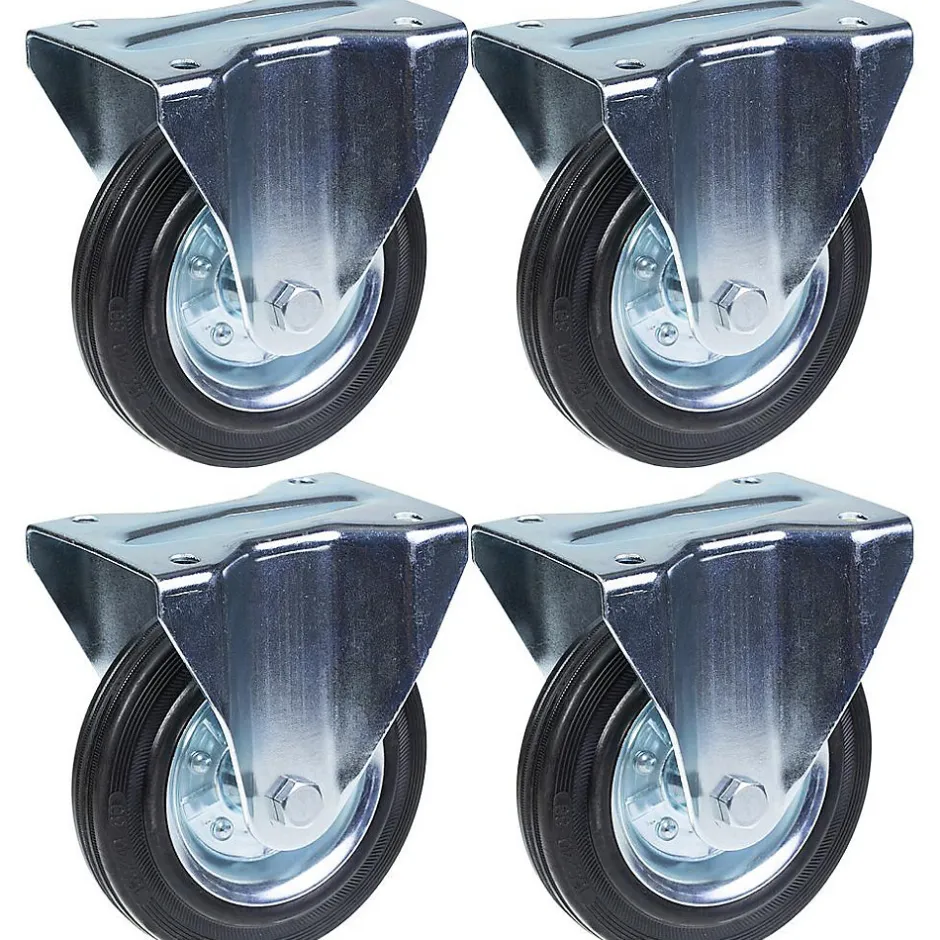 Jeu de 4 roulettes en caoutchouc noir de 160 mm avec plaque supérieure.Ces 4 roulettes fixes ont des roues en caoutchouc noir avec des centres en acier pressé.Les dimensions de l’article sont les suivantes :Diamètre de la roue : 160mmLargeur de la bande de roulement : 39mmRoulement de roue : Roulement à rouleauxTaille de la plaque supérieure : 146x107mmCentre des trous de montage : 105x80mmTaille des trous de montage : 11 mmHauteur totale : 193 mmCapacité de charge : 150 kg par roulette (600 kg par jeu).Dureté de la bande de roulement 85° Shore A.Résistance au roulement raisonnable, faible bruit de fonctionnement et très bonne préservation des sols.Bonne résistance chimique, sauf aux huiles.