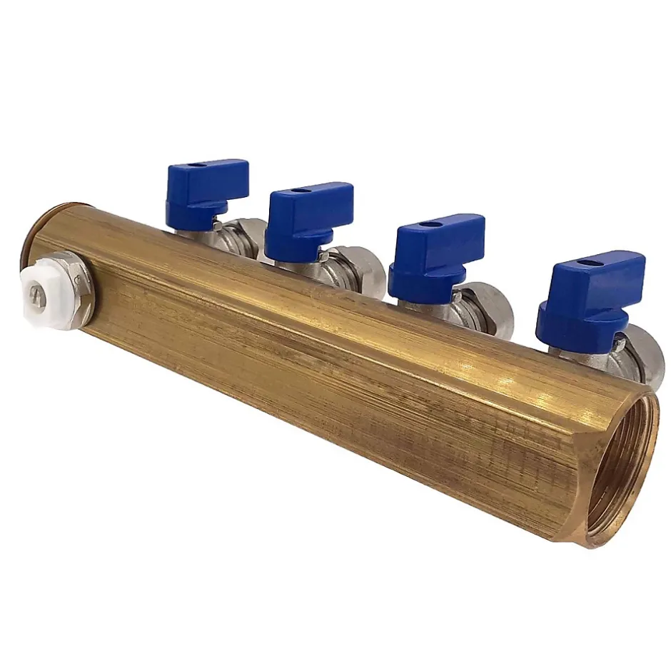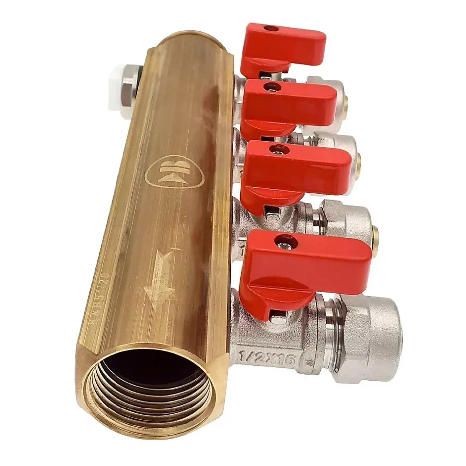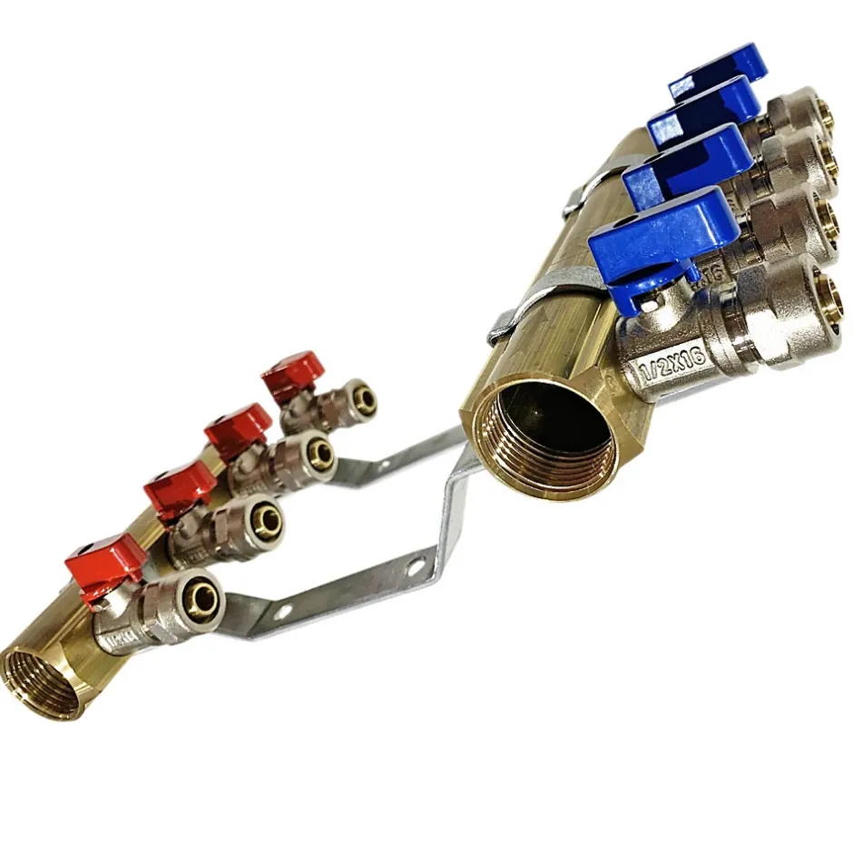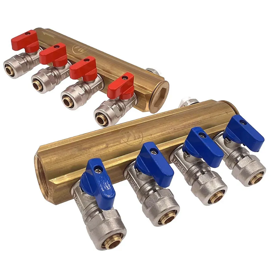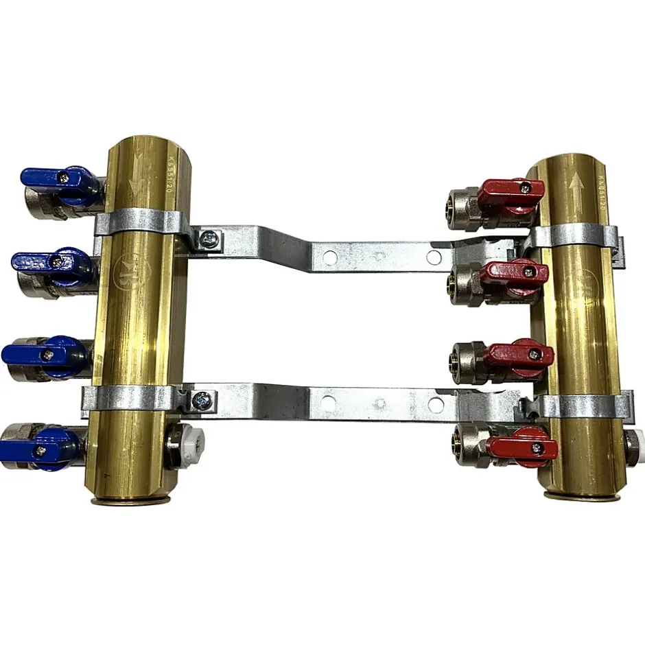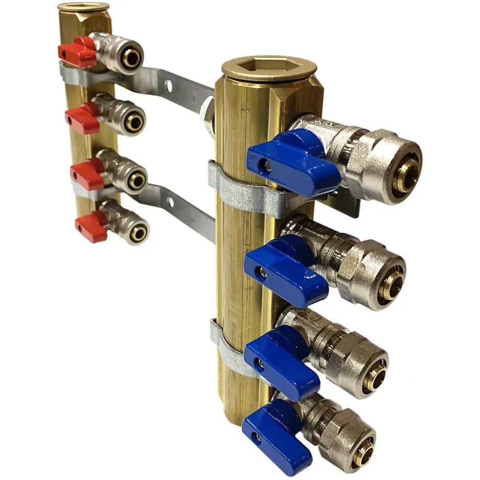 2 collecteurs 4 sorties + 8 vannes + bouchons purgeur + fixations CARACTÉRISTIQUES : Ensemble 2 collecteurs barreau 4 sorties femelle en laiton avec trou de purge + les fixations pour tube PER Ø16 x1/2″. Collecteur vendu avec 8 vannes à bille droit à visser pour tube PERØ16X1/2 » (4 rouges + 4 bleues) et 2 bouchons purgeur d’air. Collecteur produit à partie d’une barre profilée en laiton. Vannes à raccordement mâle à compression à visser. Collecteur à utiliser dans les installations d’eau, chauffage et sanitaire. À NOTER : pas de livraison en Corse ou sur les îles.