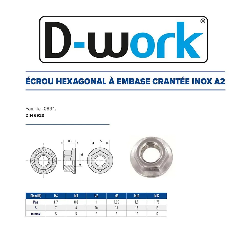Présentation du produit : Découvrez notre lot de 200 écrous embase crantée D.6 en Inox A2, conformes à la norme DIN 6923. Ces écrous sont idéaux pour des applications nécessitant une fixation robuste et durable. Leur conception crantée assure une meilleure prise et une résistance accrue aux vibrations. Caractéristiques principales : : Quantité : 200 pièces Diamètre : D.6 mm Matériau : Inox A2 Norme : DIN 6923 Avantages : : Ces écrous en Inox A2 sont résistants à la corrosion, ce qui les rend parfaits pour une utilisation en extérieur ou dans des environnements humides. Leur conception crantée permet une fixation sécurisée, réduisant le risque de desserrage. Utilisation : : Pour une utilisation optimale, assurez-vous que les écrous sont correctement serrés avec les boulons appropriés. Idéal pour les projets de construction, de mécanique ou de bricolage.