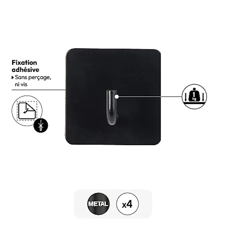 4 patères adhésives « Stiky » 4,5×2,7cmDimensions : L. 4.5 x P. 2.7 x H. 4.5 cmColoris : NoirMarque : 5 five simply smart