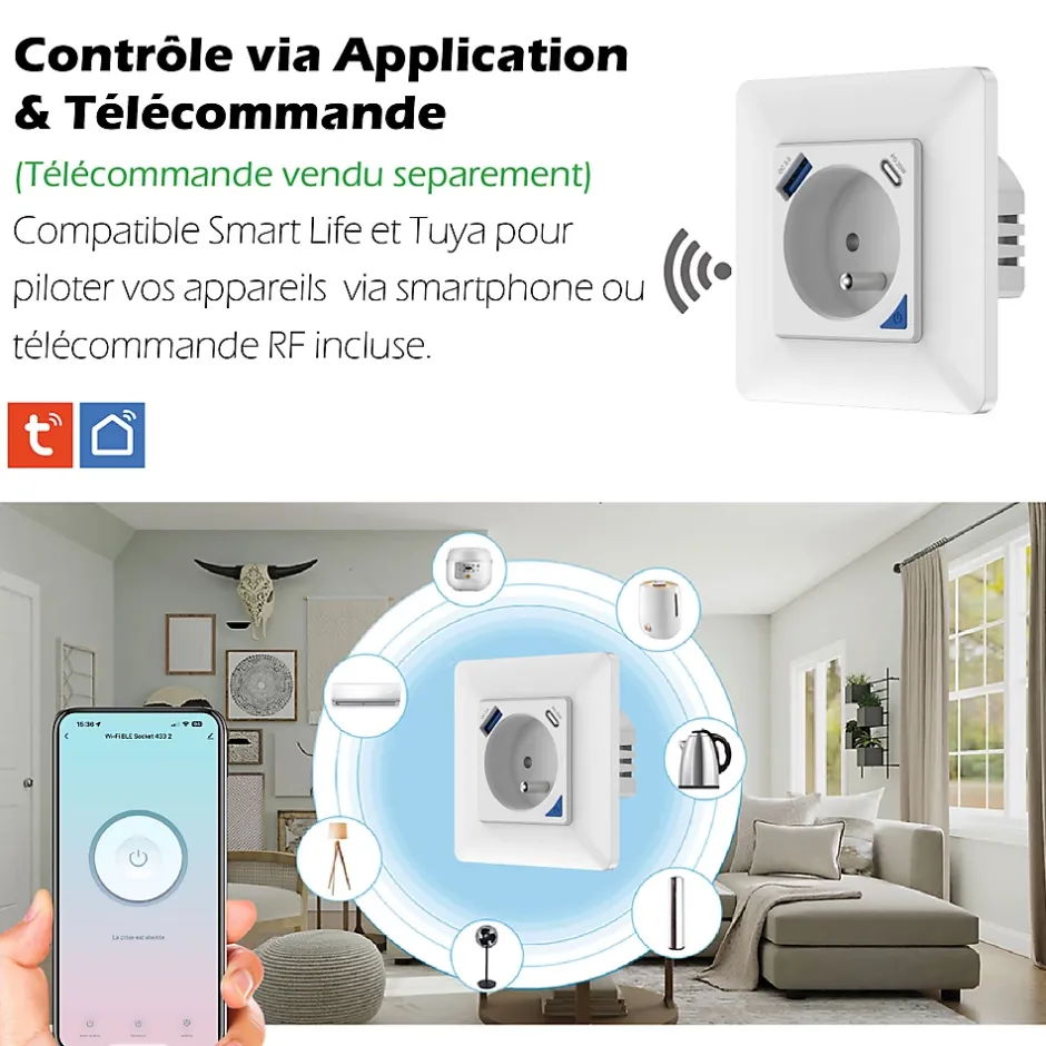 DescriptionApplication de contrôle : Smart Life / Tuya SmartTransmission réseau : Wi-Fi 2,4 GHz (IEEE 802.11 b/g/n)Puissance max. transmission Wi-Fi : 0,6 WBande de fréquence : 2400–2483,5 MHz – max. 20 dBmType de prise : FR (Type E – standard français)Tension de fonctionnement : 220–240 VPuissance maximale : 3000 WCourant nominal : 16 AIndice de protection : IP20 (usage intérieur)Plage de température : -15 °C à +80 °CHumidité de fonctionnement : 40 % – 80 %Matériau : PC (polycarbonate, résistant & ignifugé)Dimensions : 86 × 86 × 43 mmDurée de vie LED témoin : > 20 000 h Idéal pour✅ Automatiser vos équipements électriques (chauffage, TV, électroménager…).✅ Réduire vos factures en coupant les appareils en veille.✅ Programmer vos appareils selon vos habitudes (scénarios domotiques).✅ Intégrer une solution domotique discrète et élégante directement dans vos murs.