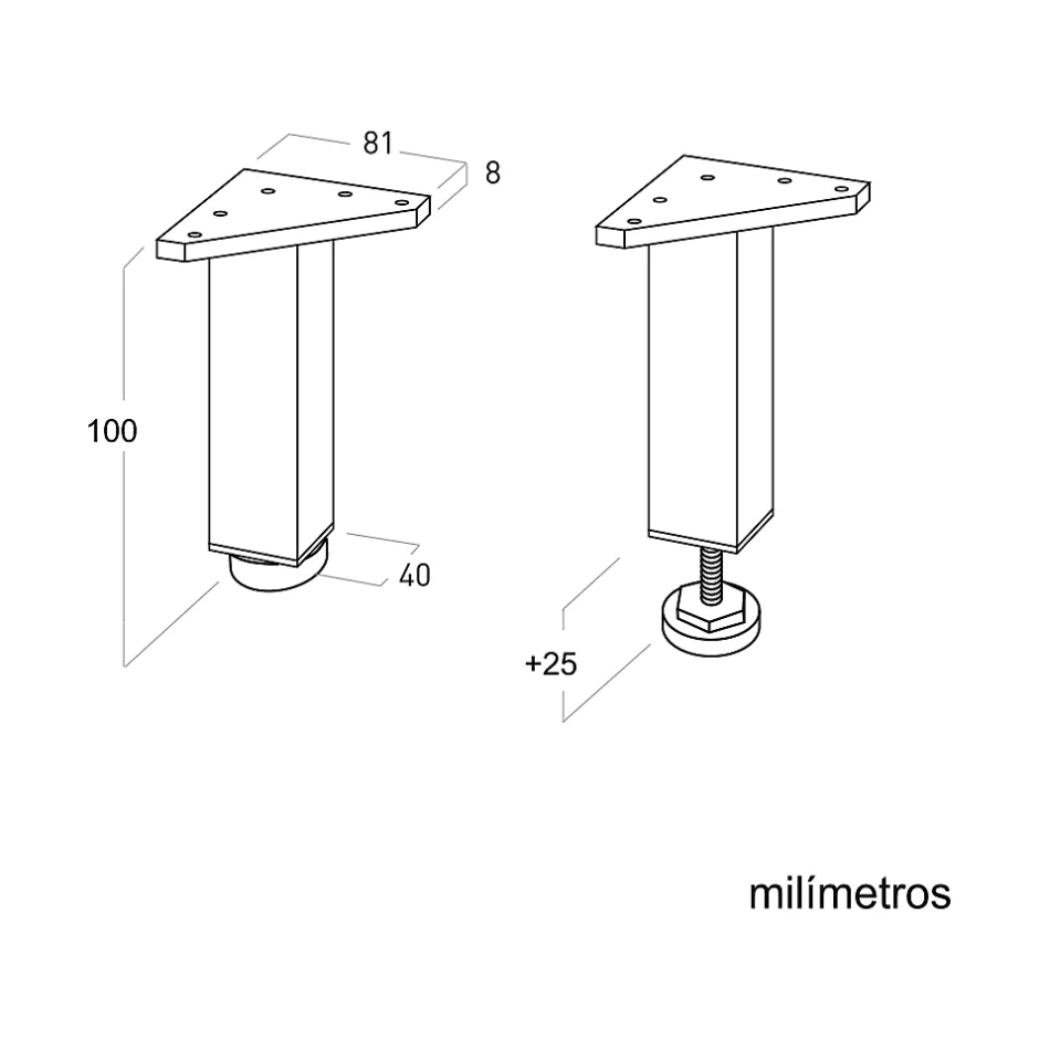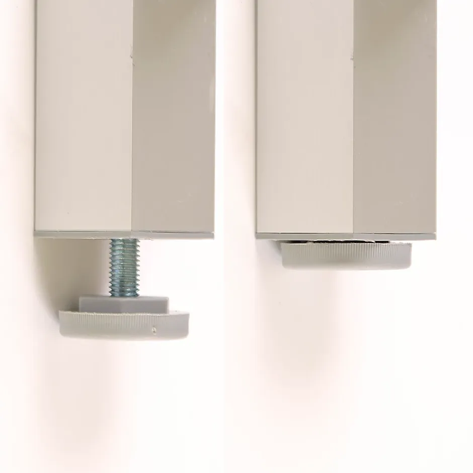 Pied carré pour meuble en aluminium 40x40mm hauteur 100mm aluminium mat avec régulateur de nivellement. Vous pourrez facilement le monter sur la base du meuble grâce aux vis de montage fournies. Avant de choisir le modèle vous devrez mesurer la hauteur que vous souhaitez laisser entre le meuble et le sol, en pensant à son nettoyage. Le matériau de fabrication de ces pieds est en ABS/aluminium. En bas, il dispose d’un régulateur de hauteur fileté qui vous permettra de niveler le meuble ou la table sur tous types de sols.