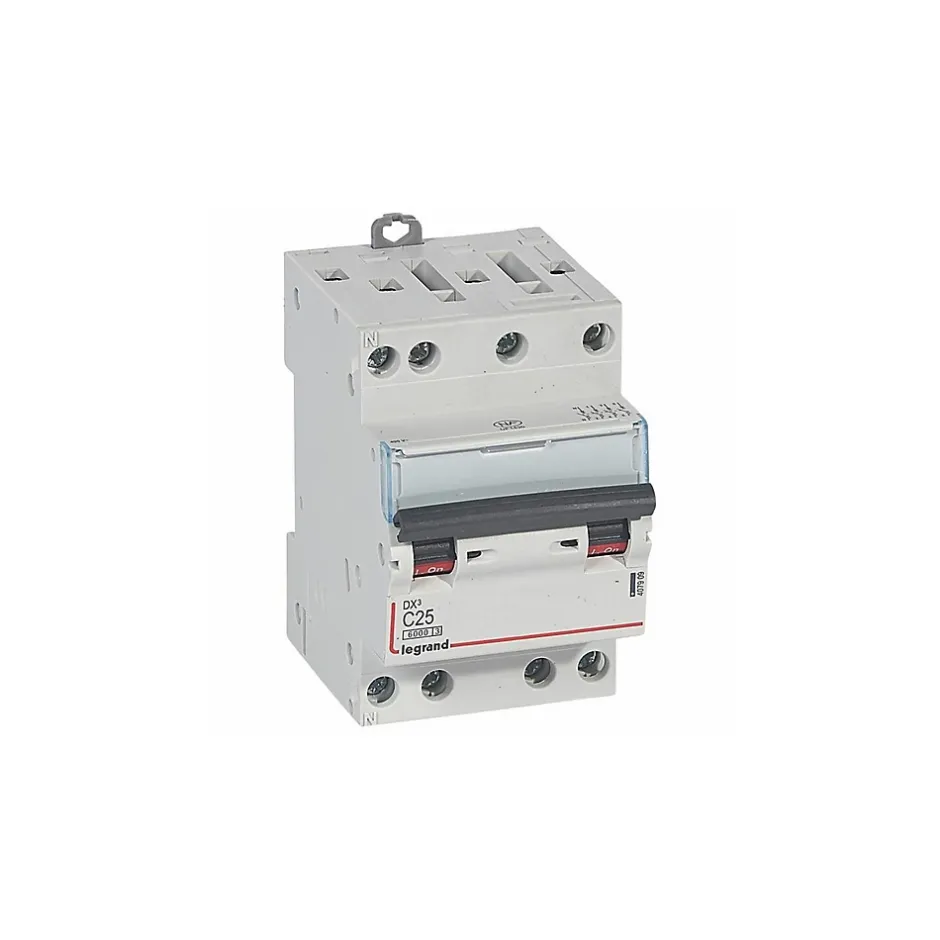 Disjoncteur Legrand tétrapolaire avec arrivée haute et départ bas à vis pour peigne HX³ optimisé Ce disjoncteur 4P est fabriqué par Legrand. Il appartient à la gamme DX3.Dans le respect de la norme EN60947-2, il assure un pouvoir de coupure de 10kA (protection des circuits électriques tertiaires et industriels). Il assure également un pouvoir de coupure de 6kA pour être conforme à la norme EN60868-1 (protection des circuits électriques résidentiels).Ce disjoncteur est raccordé au circuit via un système de connexion à vis. Il occupe 3 modules de 18mm sur le rail DIN de votre tableau électrique.Calibré à 25A, le disjoncteur 407909 courbe C doit être installé sur un circuit de tension 380V.L’essentiel du disjoncteur Legrand 407909Courbe CPouvoir de coupure en habitation : 6kAPouvoir de coupure en industrie : 10kACalibrage : 25ATension nominale : 380V