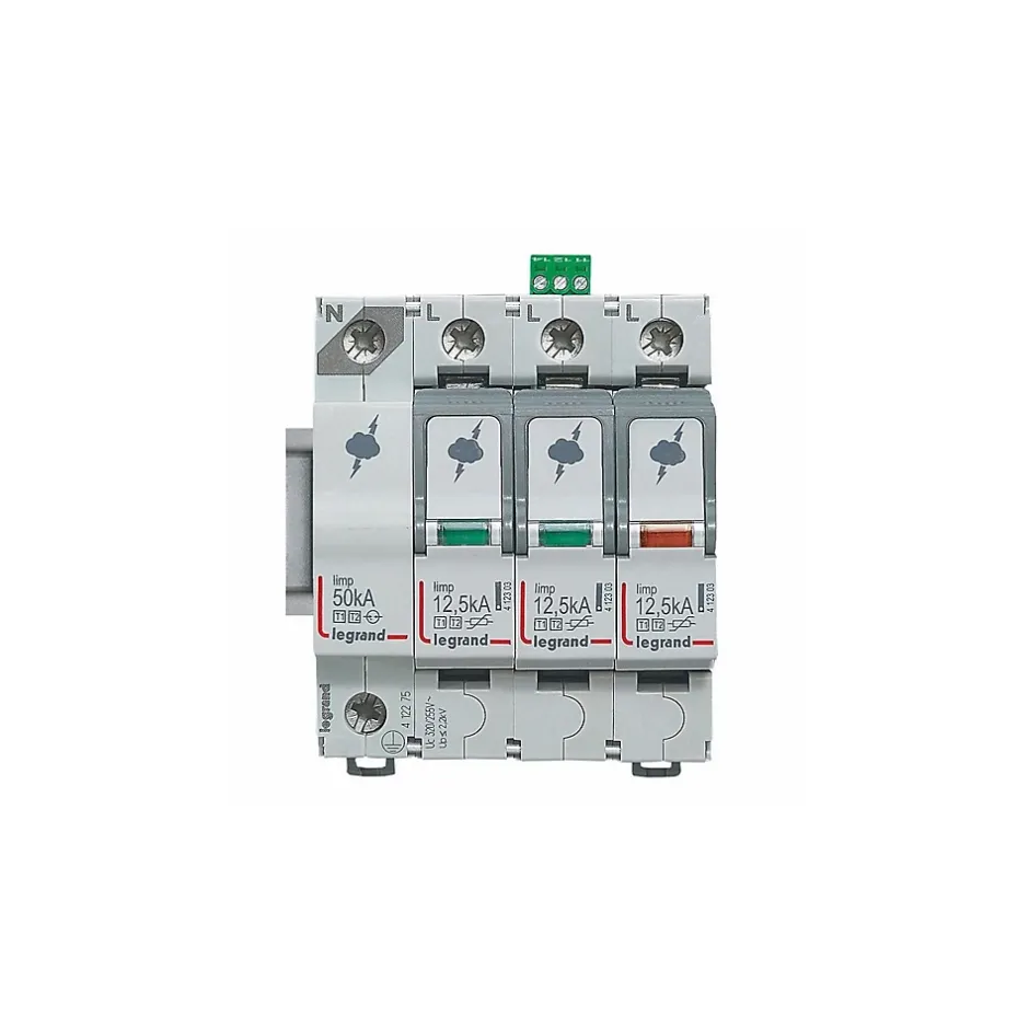 Parafoudre triphasé + neutre Legrand 412275Ce parafoudre 3P+N de type 1 et type 2 sert a protéger votre installation et vos appareils électriques.Le parafoudre modulaire Legrand 412275 est un parafoudre sans auto protection (disjoncteur à commander séparément). Cette protection assure la sécurité du circuit quand le parafoudre arrive en fin de vie (obligatoire selon NF C 15-100)Ce dispositif de protection contre la foudre inclut un indicateur d’état de fin de vie en façade du parafoudre. L’indicateur est vert quand le parafoudre est en fonctionnement et il est rouge quand la cartouche est à remplacer Ce parafoudre dispose d’un courant nominal de décharge de 25 kA . Il dispose également d’un courant max de décharge de 60kA, Cette valeur correspond à l’intensité max que peut écouler un parafoudre sur un choc de foudre.Ce dispositif est connecté au circuit par un système de connexion à vis.L’essentiel sur le parafoudre Legrand 412275Courant nominal de décharge In = 25 kA Courant max de décharge Imax= 60kAType 1|Type 2parafoudre auto protégé : NonReport de signalisation : OuiParafoudre débrochable (cartouches remplaçables)