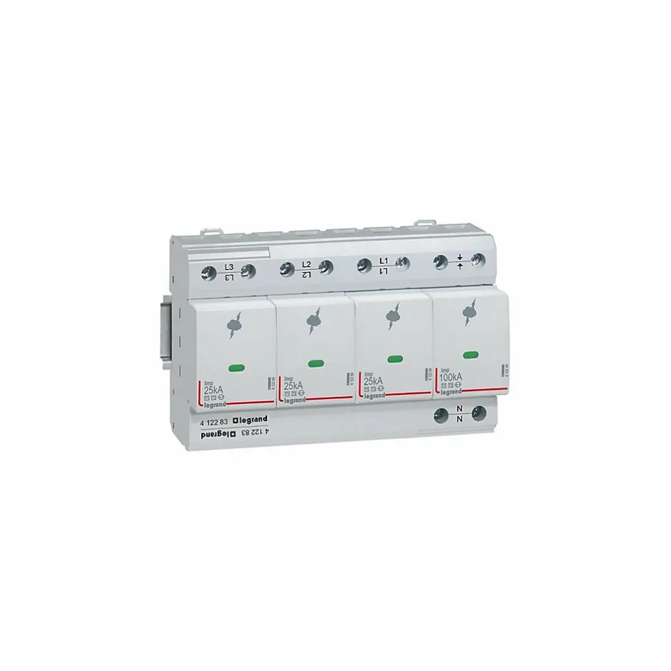 Parafoudre triphasé + neutre Legrand 412283Ce parafoudre 3P+N de type 1 est installé en tête de tableaux électrique quand l’installation dispose d’un paratonnerre. Il est positionné en aval du disjoncteur de branchement.Le parafoudre modulaire Legrand 412283 est un parafoudre sans auto protection (disjoncteur à commander séparément). Cette protection assure la sécurité du circuit quand le parafoudre arrive en fin de vie (obligatoire selon NF C 15-100)Ce dispositif de protection contre la foudre inclut un indicateur d’état de fin de vie en façade du parafoudre. L’indicateur est vert quand le parafoudre est en fonctionnement et il est rouge quand la cartouche est à remplacer Ce parafoudre dispose d’un courant nominal de décharge de 25 kA . Il dispose également d’un courant max de décharge de 50kA, Cette valeur correspond à l’intensité max que peut écouler un parafoudre sur un choc de foudre.Ce dispositif est connecté au circuit par un système de connexion à vis.L’essentiel sur le parafoudre Legrand 412283Courant nominal de décharge In = 25 kA Courant max de décharge Imax= 50kAType 1parafoudre auto protégé : NonReport de signalisation : OuiParafoudre débrochable (cartouches remplaçables)