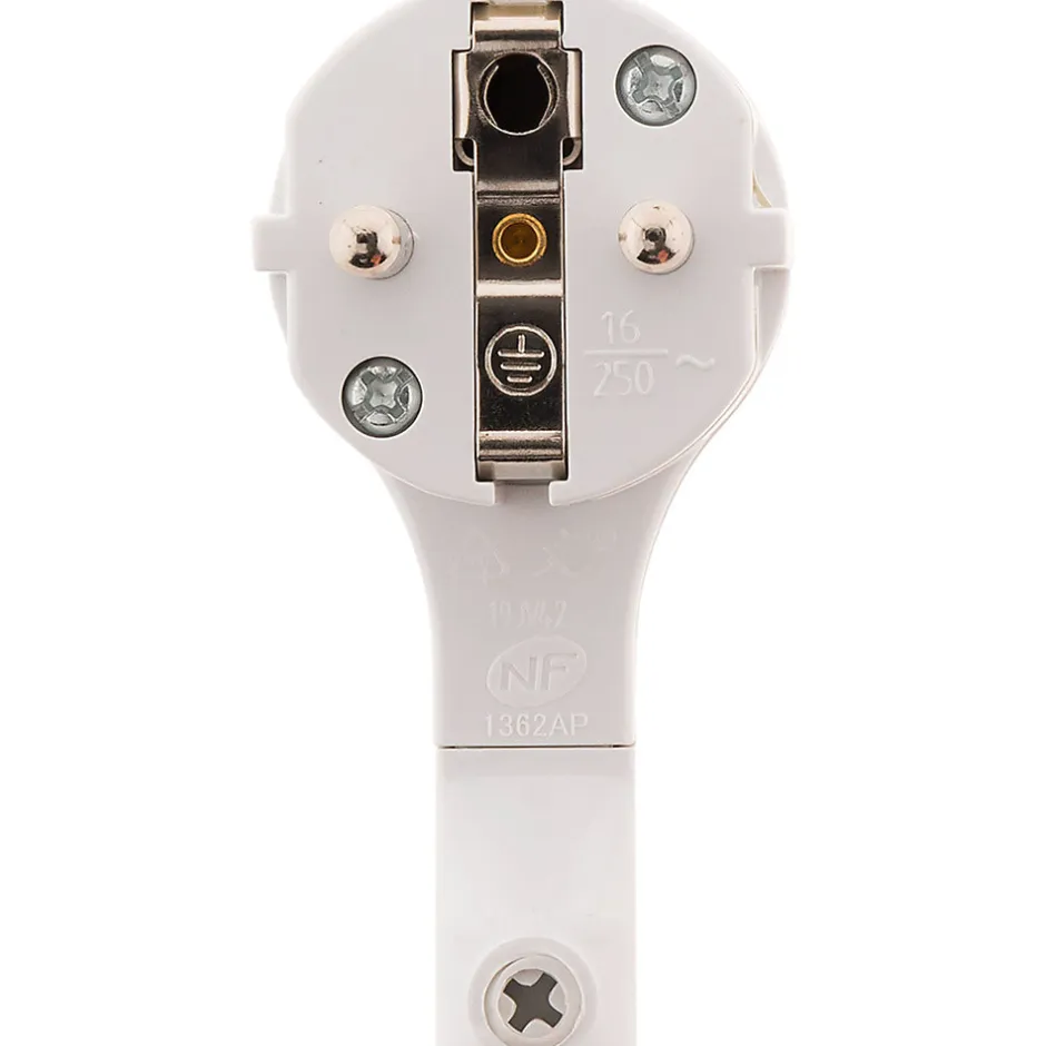 Fiche électrique mâle extraplate 2P+T 16A. Couleur(s) : blanc. Sortie : droite. Équipement : anneau d’extraction intégré. Compatibilité câble : HO5VV-F 3G1 / 3G1,5 mm². Puissance maximale : 3680 W sous 230 V. Conforme à la norme NF