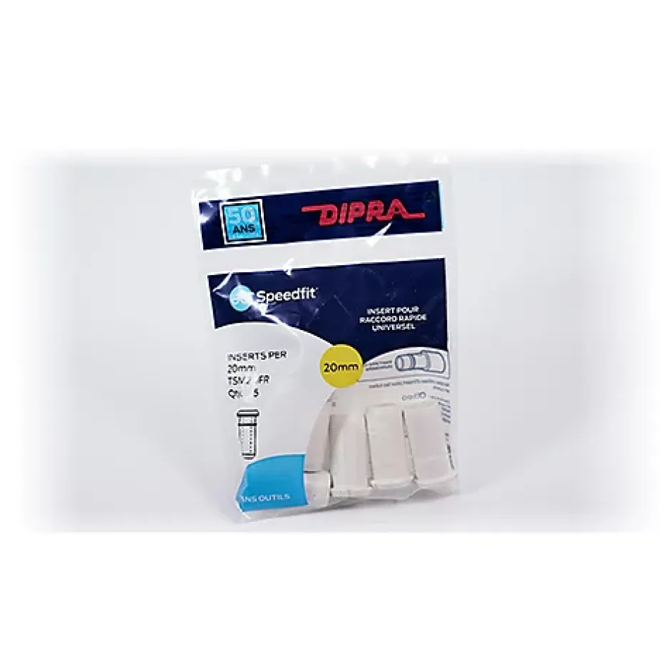 Lot de 5 inserts spécial PER et PE-RT Ø20 mm pour connexion d’un raccord automatique.Les inserts sont obligatoires lorsque l’on utilise des raccords rapide, automatiques et universels avec des tubes en plastique (PER ou PE-RT). L’insert permet au tube de garder sa forme arrondie à l’intérieur et permet d’éviter que sa forme ne change en cas de changement brusque de pression dans le réseau d’eau.Ne pas utiliser d’inserts sur une installation en cuivre.Garantie 50 ans.Recommandé avec : 418828,418840,781430,781440.