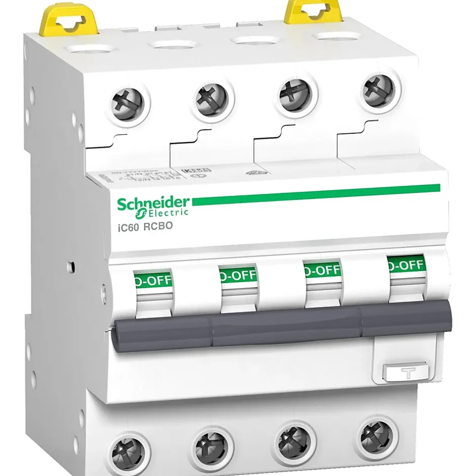 Disjoncteur différentiel 300mA 16A 4P Courbe C – Schneider A9D55416Ce disjoncteur différentiel 300mA de calibre 16A est équipé de bornes de connexion À vis.Un disjoncteur différentiel avec une sensibilité de 300 mA est interdit dans une habitation.La réputation de la gamme Acti 9 iC60 RCBO de chez Schneider Electric n’est plus à faire tant elle est réputée en terme de fiabilité et de sécurité.Ce disjoncteur différentiel assure un pouvoir de coupure de 6kA conformément à la norme NF EN60947-2.Le différentiel A9D55416 occupe 4 modules de 18mm sur votre coffret électrique.Cette protection différentielle est fabriqué en Portugal par Schneider Electric et bénéficie d’une certification CE.Les points clés du Schneider A9D55416Certification CEFabriqué en PortugalCourbe CType ACBornes de raccordements À visProtection différentielle de sensibilité 300mA (interdit dans une habitation)Calibre6kA