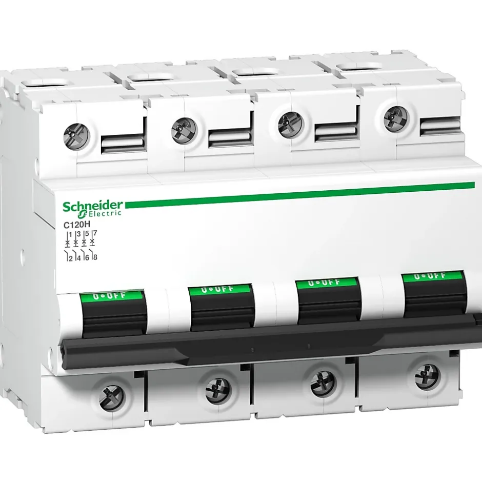 Disjoncteur 4P 100 A courbe C – Schneider A9N18480Ce disjoncteur tétrapolaire de Calibre 100 A est équipé de bornes À vis d’une capacité de 1 à 50mm² en fil rigide et de 1,5 à 35mm² avec du fil souple avec embouts de câblage.Le disjoncteur Schneider A9N18480 est compatible avec des peignes électriques au pas de 27mm Issu de la gamme Acti 9 C120H de chez Schneider, ce disjoncteur assure un pouvoir de coupure de 15kA selon la norme NF EN60947-2 (industriel et tertiaire) et 15kA selon la norme NF EN60898-1 (habitation).Le A9N18480 occupe 6 modules de 18mm sur votre tableau électrique.Ce disjoncteur magnétothermique est fabriqué en France par Schneider et bénéficie d’une certification CE.Les points clés du disjoncteur A9N18480certification CEFabriqué en Francecourbe CBornes À visFonctionne sur 380V tétrapolaireCalibrage 100 A