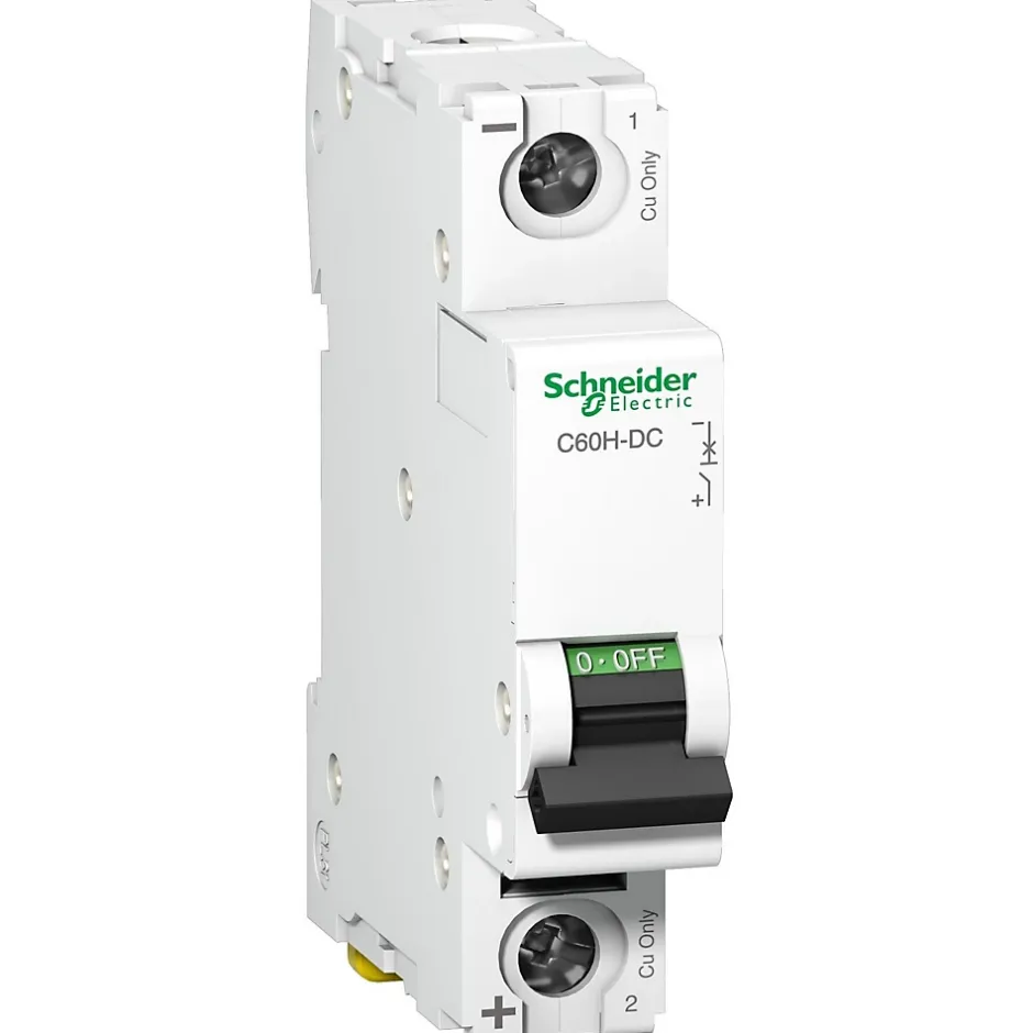 Disjoncteur 1P 63A courbe C – Schneider A9N61519Ce disjoncteur unipolaire de Calibre 63A est équipé de bornes À vis.Issu de la gamme Acti 9 C60H-DC de chez Schneider, ce disjoncteur courant continu (dc) assure un pouvoir de coupure de 6kA selon la norme NF EN60947-2 (industriel et tertiaire). Pour une tension nominale 250Vcc.Le A9N61519 occupe 1 module de 18mm sur votre tableau électrique.Ce disjoncteur dc est fabriqué par Schneider et bénéficie d’une certification CE.Les points clés du disjoncteur A9N61519Courant continu (dc).certification CEcourbe CBornes À visFonctionne sur 250Vcc unipolaireCalibrage 63A