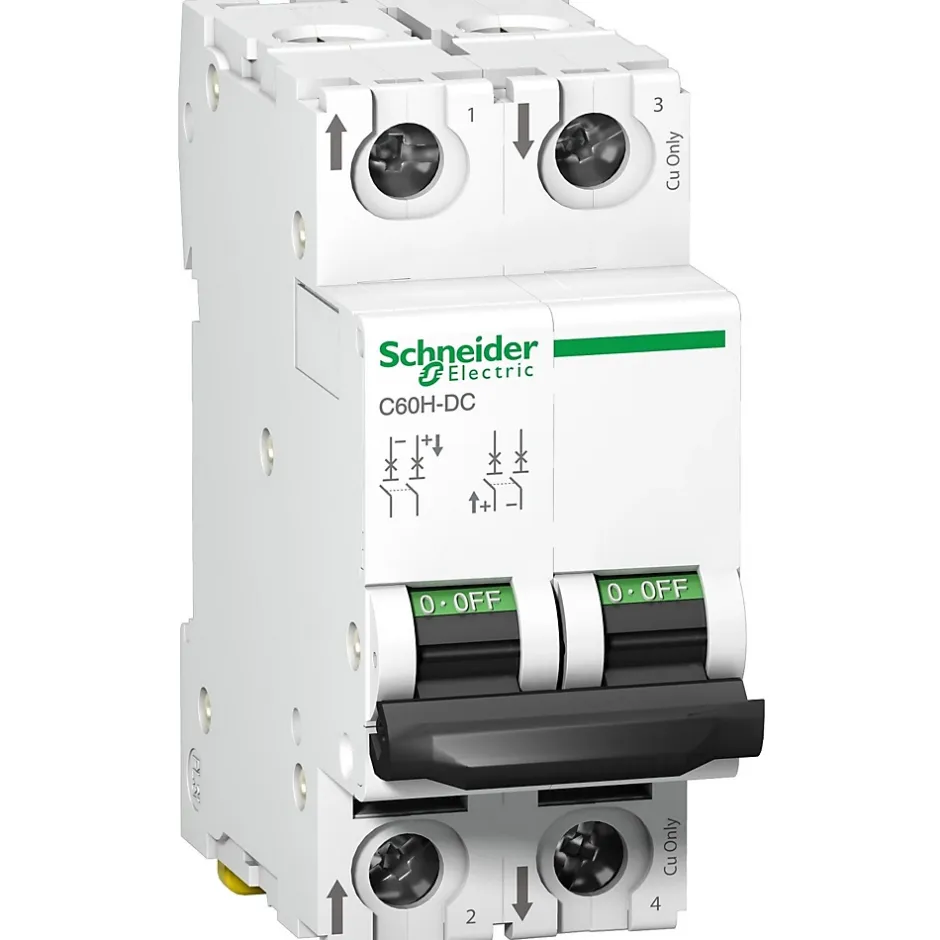 Disjoncteur 2P 32A courbe C – Schneider A9N61535Ce disjoncteur bipolaire de Calibre 32A est équipé de bornes À vis.Issu de la gamme Acti 9 C60H-DC de chez Schneider, ce disjoncteur courant continu (dc) assure un pouvoir de coupure de 6kA selon la norme NF EN60947-2 (industriel et tertiaire). Pour une tension nominale 500Vcc.Le A9N61535 occupe 2 modules de 18mm sur votre tableau électrique.Ce disjoncteur dc est fabriqué par Schneider et bénéficie d’une certification CE.Les points clés du disjoncteur A9N61535Courant continu (dc).certification CEcourbe CBornes À visFonctionne sur 500Vcc bipolaireCalibrage 32A