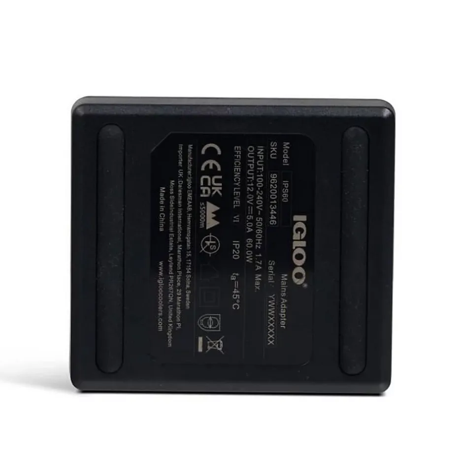 Caractéristiques produitConvertit le courant secteur 230V en sortie 12V type allume-cigare pour alimenter les glacières 12VCâble secteur 230V détachable fourni (Europlug Type C) pour une connexion simpleBoîtier compact en plastique mat noir avec logo IGLOO et pieds en caoutchouc antidérapantsPratique pour une utilisation intérieure ou lors de déplacements sans prise 12VRecommande lutilisation des accessoires dorigine pour des performances optimalesUtilisationPermet dalimenter une glacière 12V depuis une prise secteur 230V : branchez le câble secteur fourni sur lentrée IEC du boîtier puis connectez la fiche 12V de la glacière à la prise allume-cigare femelle.ConnectiqueEntrée : prise femelle de type IEC 2 broches pour le câble secteur détachable.Sortie : prise 12V allume-cigare femelle compatible avec les fiches cylindriques standard des glacières 12V.Caractéristiques physiquesBoîtier rectangulaire compact en plastique mat, bords légèrement arrondis, logo IGLOO centré sur la face supérieure, petite empreinte maniable et pieds en caoutchouc visibles sous lunité.Contenu du packAdaptateur secteur 230V vers 12V et câble secteur détachable Europlug (Type C).