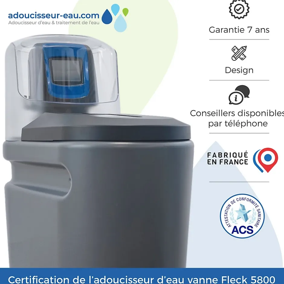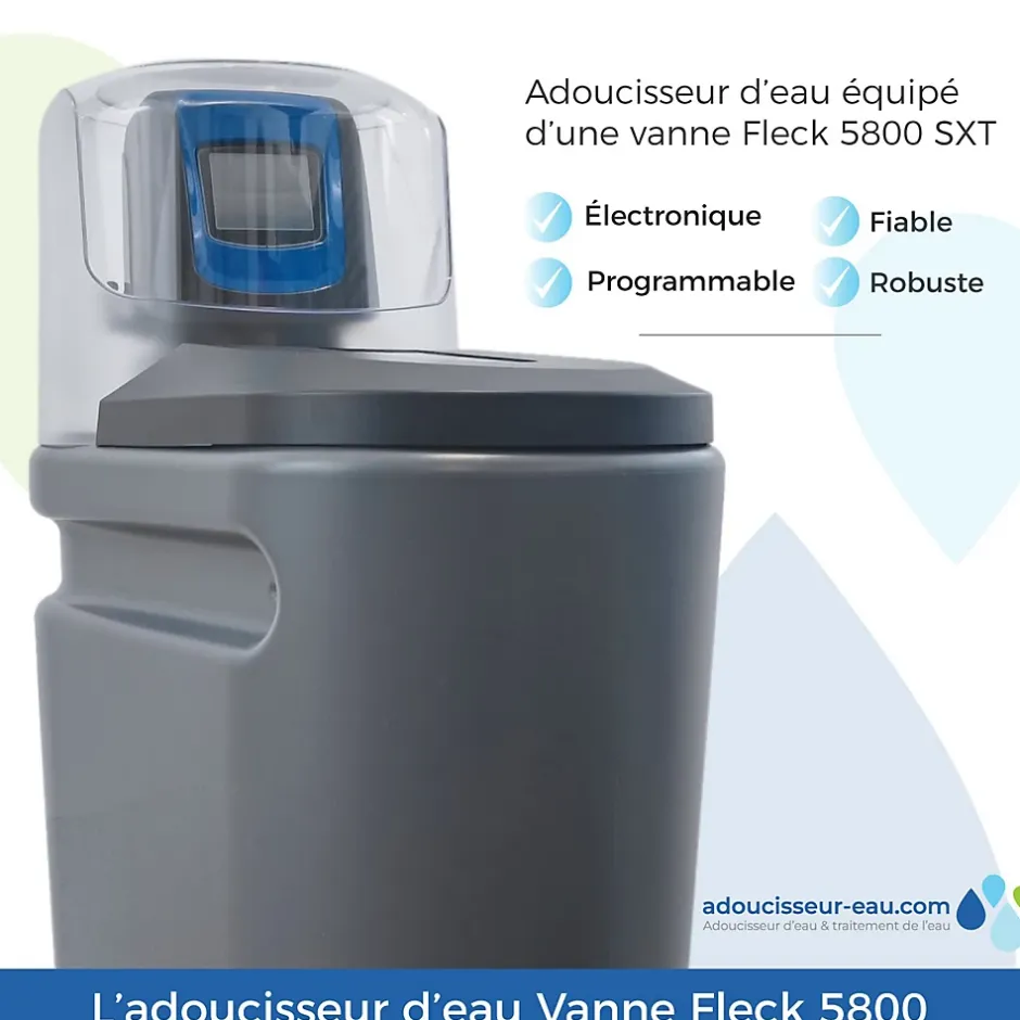 La vanne Fleck 5800 XTR est d’une grande fiabilité de par sa robustesse et sa simplicité. La régénération est lancée lorsque le volume de traitement est atteint, pas de gaspillage ! En fonction de l’application la régénération peut être immédiate, retardée, chronométrique retardée ou hebdomadaire.L’affichage électronique rétro-éclairé vous permettra de visionner le volume restant avant la prochaine régénération en mode service ou le cycle et le temps restant en mode régénération.En cas de coupure de courant inférieure à 48h, les paramètres sont sauvegardés. Notre résine de qualité alimentaire, échangeuse d’ions, qui bénéficie de l’attestation de conformité sanitaire ACS vous permettra de consommer l’eau sans matériel supplémentaire de traitement. Le grand pouvoir d’échange de cette résine permet une consommation de sel réduite et une durée de vie allongée.Pour un adoucisseur d’eau correctement dimensionné et correctement entretenu, la durée de vie est estimée à 15 ans. Notre kit de montage inclus vous permettra de réaliser rapidement et facilement l’installation de votre adoucisseur, tout en bénéficiant d’une pré-filtration efficace.Ce kit comprend :1 filtre de protection complet 9″3/4 avec cartouche microfibre 20 µmmamelons en laitonéquerre de fixation et clé de démontage1 trousse d’analyse TH1 mini coupe-tube2 raccords rapides de diamètre 18 mm3 flexibles en inox.