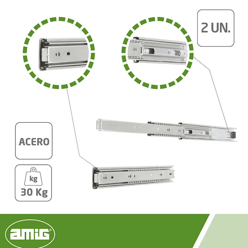 Coulisses à billes métalliques pour tiroirs à sortie totale. Avec roulements. Résistance: 30 kg/paire. Démontables.