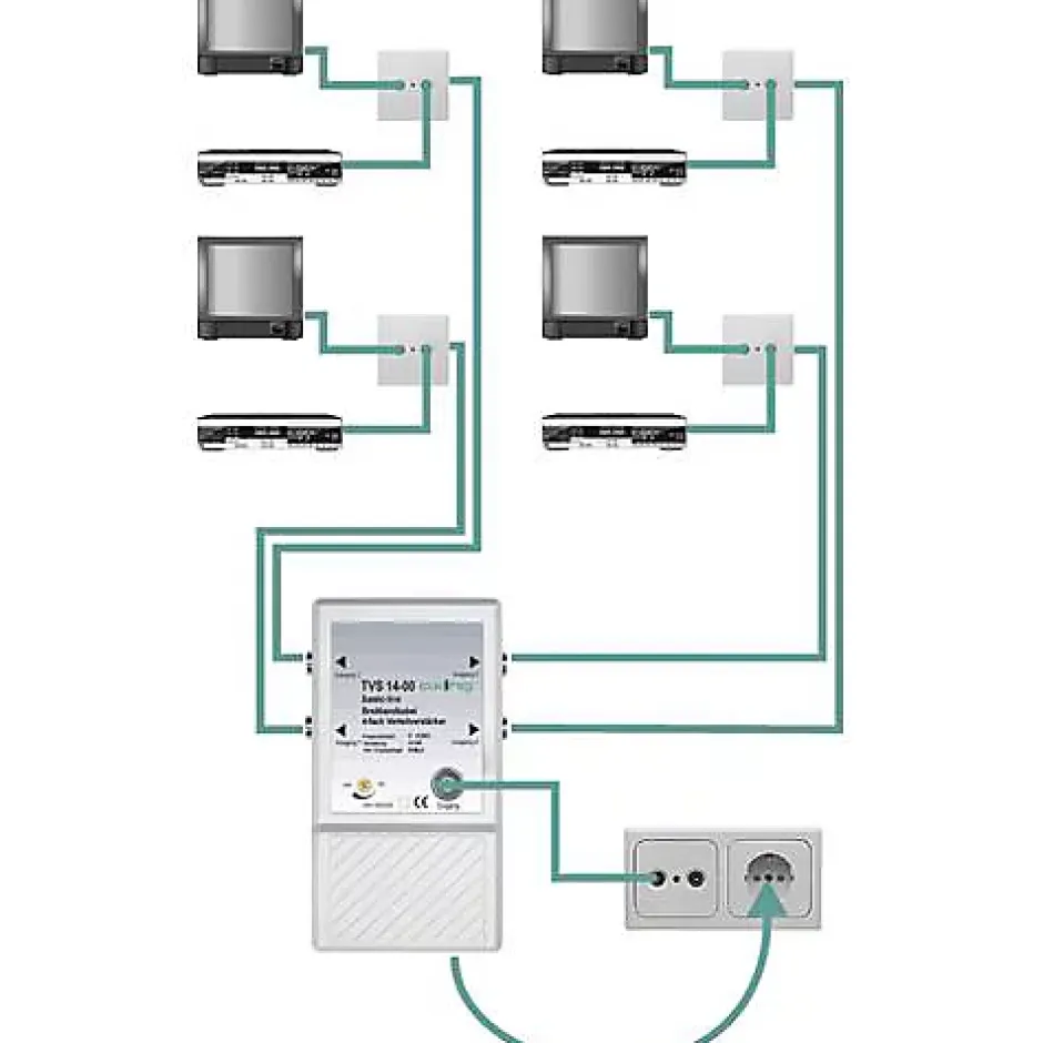 Amplificateur répartiteur Axing TVS 14 conçu pour distribuer le signal d’une prise antenne vers plusieurs appareils. Une entrée IEC, six sorties IEC, gain 4 x 10 dB et atténuation réglable 0-20 dB pour ajuster l’intensité. Alimentation secteur intégrée 230 V/50 Hz, boîtier métal et plastique. Plage de fréquence 47-862 MHz, facteur de bruit 7 dB, niveau de sortie 93 dBµV. Idéal pour petits réseaux terrestres et câblés, assure une distribution stable du signal vers TV et radio.