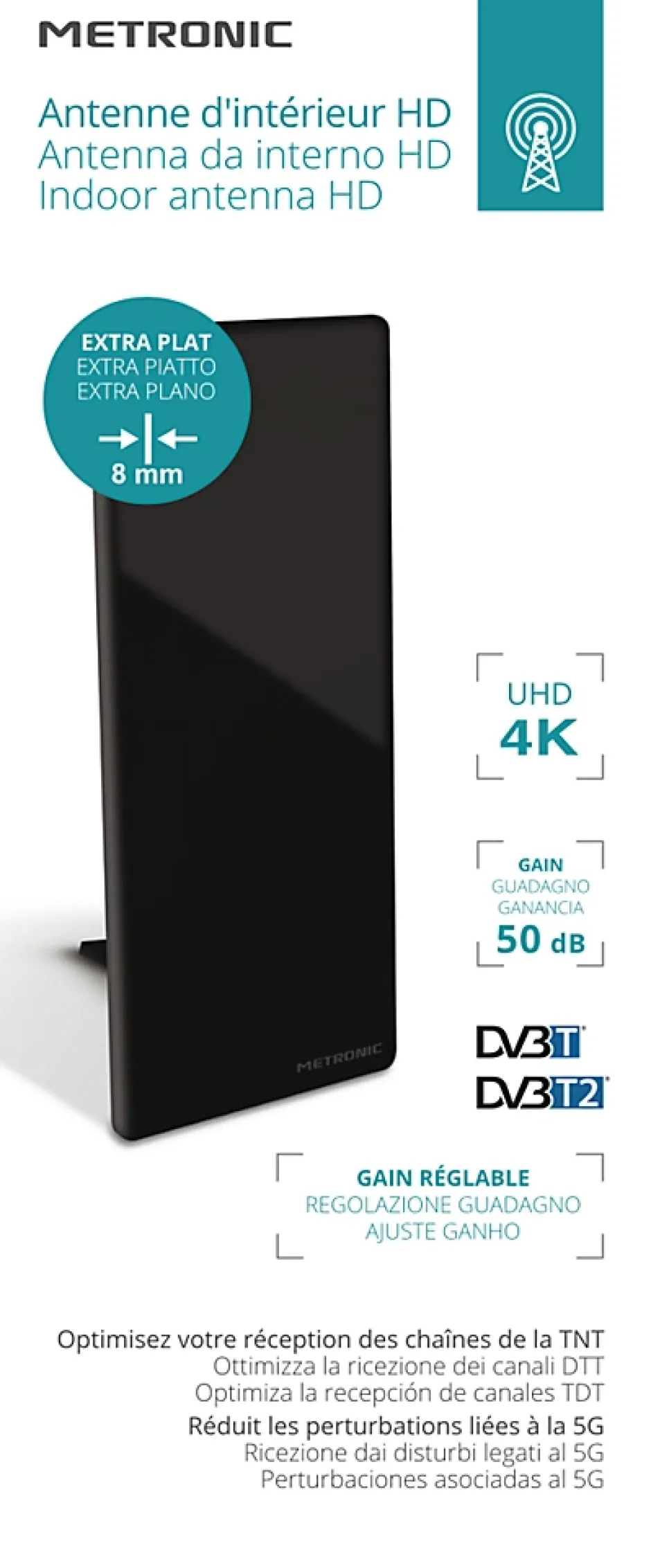 NOUVEAU STANDARD UHFRÉDUIT LES PERTURBATIONS 4GGAIN : 50dBRÉGLAGE DE GAIN Cette antenne possède une bande passante adaptée au nouveau standard UHF (largeur de bande UHF plus courte). Elle permet ainsi la réception des signaux hertziens numériques tout en réduisant les perturbations potentielles liées à la 4G. Cette antenne intérieure répond aux plus grandes exigences de la réception numérique terrestre. Elle permet également une bonne réception des chaînes de la TNT en Haute Définition. Par son design sobre et élégant elle s’adapte parfaitement à votre salon. Grâce à son accroche murale et à son pied intégré, elle vous offre deux possibilités de positionnement, au mur ou sur un meuble.PRESENTATION POINTS FORTSRéception HDRéglage de gainProlongateur M/M 9,52mm longueur 1,6mAntenne extra plate faible encombrementPeut être alimentée par un adaptateur TNT ou un téléviseur équipé de la fonction 5VCARACTERISTIQUES TECHNIQUESAlimentation fournie : 230V ~ 50 Hz / 9V courant continu 100mAAmplification : 50dBFréquences : 460 – 790 MHzDimension : Largeur 25.3 cm / hauteur 10.3 cm / épaisseur 0,7cm