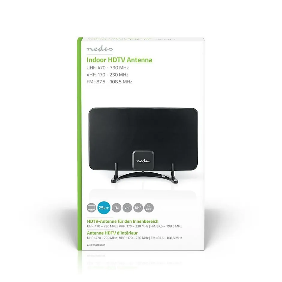 Description du produitThis indoor Nedis DVB-T/T2 antenna ensures a stable reception of free-to-air channels, pay television (if youre subscribed) and FM radio signals. The antenna features a compact and stylish design that blends in with any interior, without being too distracting.CaractéristiquesCette antenne d’intérieur DVB-T/T2 Nedis assure une réception stable des chaînes en clair, de la télévision payante (si vous souscrivez un abonnement) et des signaux de radio FM. L’antenne dispose d’une conception compacte et élégante qui s’intègre parfaitement à tous les intérieurs.Contenu de l’emballageAntenne Guide de démarrage rapide Adaptateur secteurSpécificationsConnexion (s) d’entrée d’alimentation de l’appareil: DC 3.5 x 8.0 x 15 mmCouleur: NoirFiche d’alimentation: Euro / Type C (CEE 7/16)Filtre LTE: LTE700Gain: 26 dBGain FM: 24 dBGain UHF: 26 dBGain VHF: 26 dBGamme de fréquences FM: 87.5-108.5 MHzGamme de fréquences UHF: 470-694 MHzGamme de fréquences VHF: 170-230 MHzGamme de réception: 0-25 kmImpédance: 75 OhmIntérieur/extérieur: IntérieurLargeur: 128.0 mmLargeur horizontale du faisceau: 85 °Largeur verticale du faisceau: 63 °Longueur de corde: 2.10 mLongueur du câble de l’adaptateur secteur: 1.50 mMatériau: ABSPoids: 229 gProfondeur: 0.5 mmSupport DAB +: OuiTaille: 228.0 mmTension d’entrée: 220 – 240 VACType d’antenne: ActifType de connecteur: (Coax) IEC MâleType de signal: FMType de signal: UHFType de signal: VHFType de source