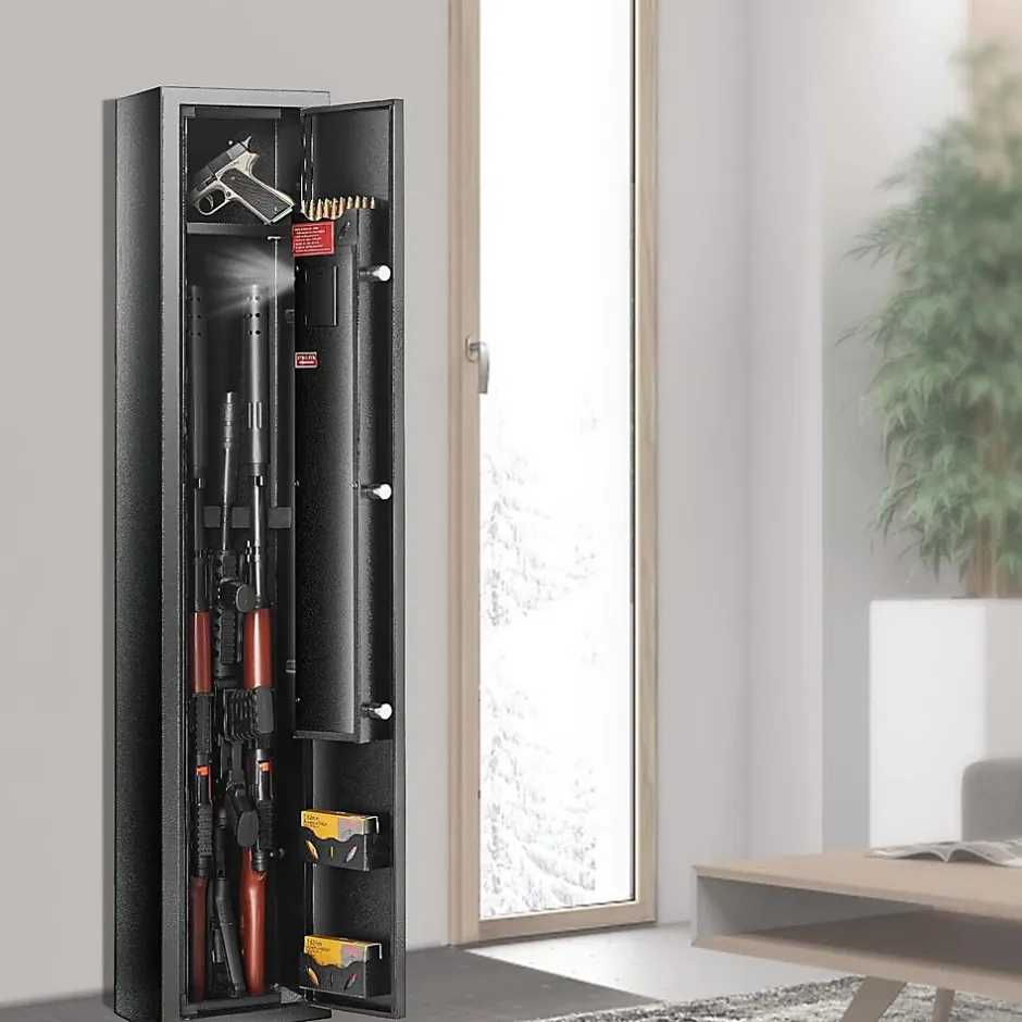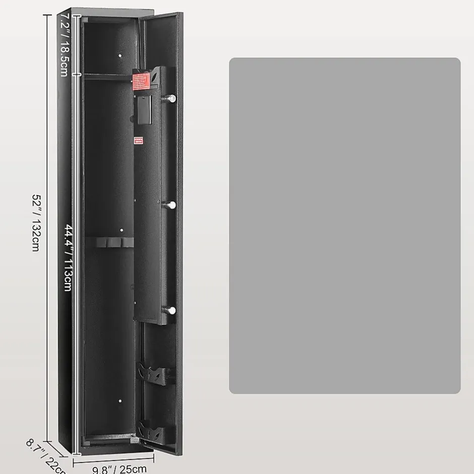 Verrouillage Intelligent par Mot de Passe : Le coffre-fort haut est équipé d’une serrure intelligente à mot de passe à 9 chiffres sur écran tactile qui sécurise votre arme à feu tout en vous permettant d’y accéder rapidement. Vous pouvez définir des codes de 3 à 12 chiffres et la serrure s’enclenche automatiquement lorsque la porte est fermée. Le coffre-fort pour fusils est également livré avec deux clés d’urgence et un boîtier de chargement externe.Grande Armoire pour Armes à Feu : Notre armoire-forte peut contenir jusqu’à trois fusils mesurant jusqu’à 122 cm, avec ou sans lunette de visée. Le porte-fusils est réglable et amovible, ce qui offre encore plus de flexibilité et de commodité. Elle comprend également un support pour 4 pistolets et trois coffres à balles pour vous aider à organiser toutes vos armes à feu et vos accessoires. Gardez vos armes à feu facilement accessibles et protégées grâce à notre armoire pour fusils.