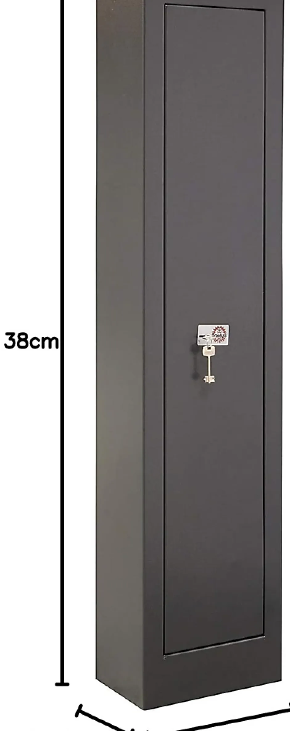 COFFRE-FORT ARMOIRE A FUSILS : fabrication en acier de 2 mm d’épaisseur porte et corps. Serrure avec 2 pênes en acier nickelé de 18 mm de diamètre.SERRURE DE SÉCURITÉ A CLÉ : ouverture et fermeture avec serrure de sécurité de 6 gorges asymétriques avec clé à double panneton.ANTI-RAYURES ET COFFRE INTÉRIEUR : avec support pour fusils en caoutchouc et tapis de sol. Permet de fixer et maintenir les armes et d’éviter les rayures et frottements. Coffre à clé à l’interieur de l’armoire, ideal pour les munitions.INSTALLATION AVEC ANCRAGE FACILE ET ÉTAGÈRE : possède 4 trous sur l’arrière pour une éventuelle fixation murale. Kit de fixation inclus (vis et chevilles). Possède egalement une étagère porte-objets, sur l’arrière de la porte.