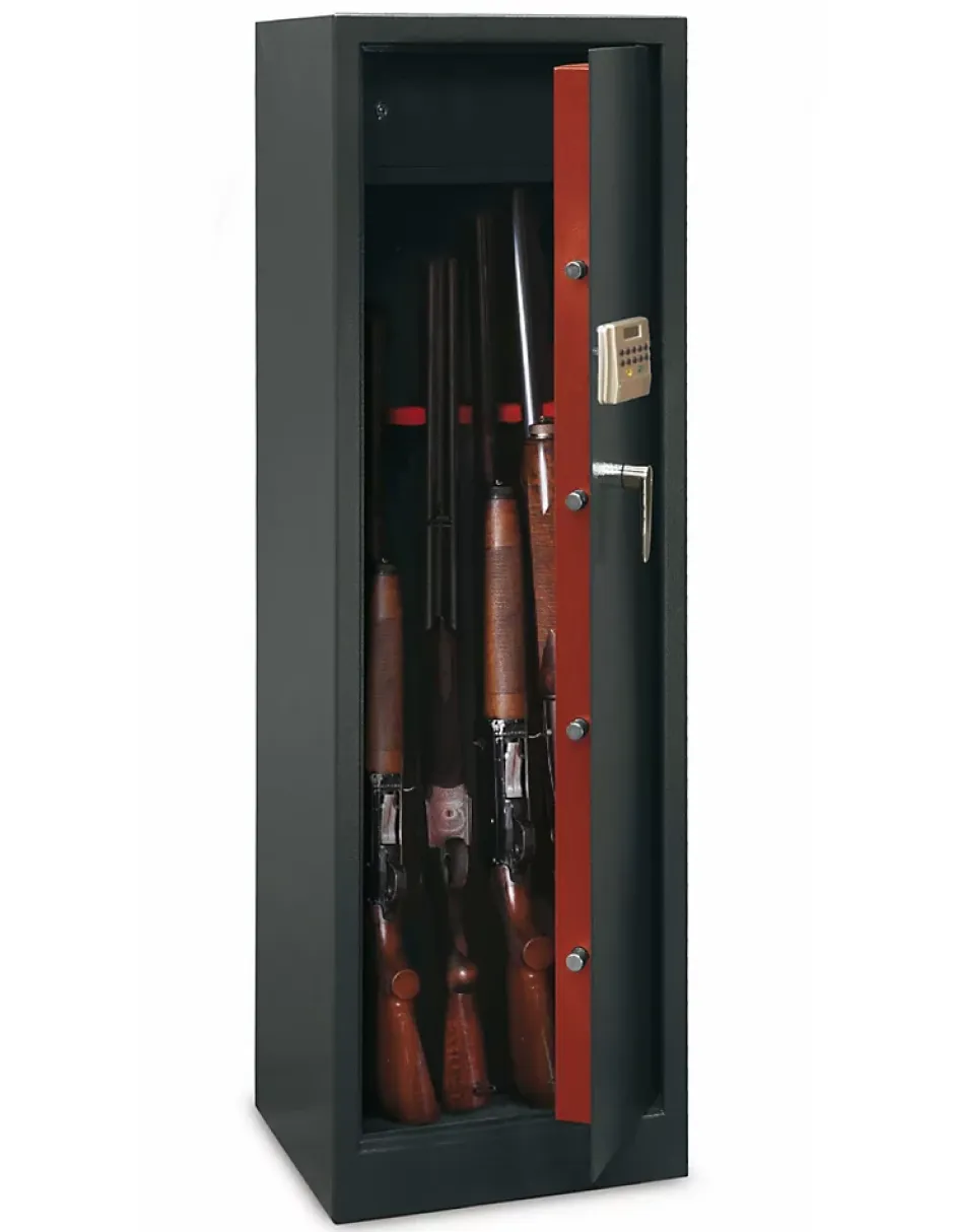 L’armoire à fusils MonteriaL’armoire à fusils Monteria possède une porte d’épaisseur de 3mm, garantissant une haute sécurité. Elle contient un coffret intérieur se fermant à clé pour ranger vos munitions avec vos fusils. Sa capacité permettra de mettre en sécurité jusqu’à 10 fusils. Fermée grâce à un code, modifiable à l’infini, vous pourrez restreindre l’accès de vos armes aux personnes de votre choix.Les armoires à fusils permettent de maintenir vos armes en bon état. Ainsi, elles seront à l’abri de l’humidité, protégées des chocs grâce à un tapis à la base de l’arme et suspendues à un râtelier en caoutchouc pour éviter qu’elles ne s’entrechoquent.Les mécanismes de sécuritéL’armoire à fusils Monteria dispose de plusieurs mécanismes de sûreté.Verrouillage par 4 pênes en acier nickelé de 20 mm de diamètre ;Ouverture par code : clavier à boutons poussoirs en ABS spécial ;Ecran LCD lumineux (cristaux liquides) à 8 positions.Installation Des trous de fixation sont prévus au dos et à la base de l’armoire à fusils Monteria pour assurer plus de sécurité.Retrouvez la réglementation des armes et leurs conservations au sein de son domicile