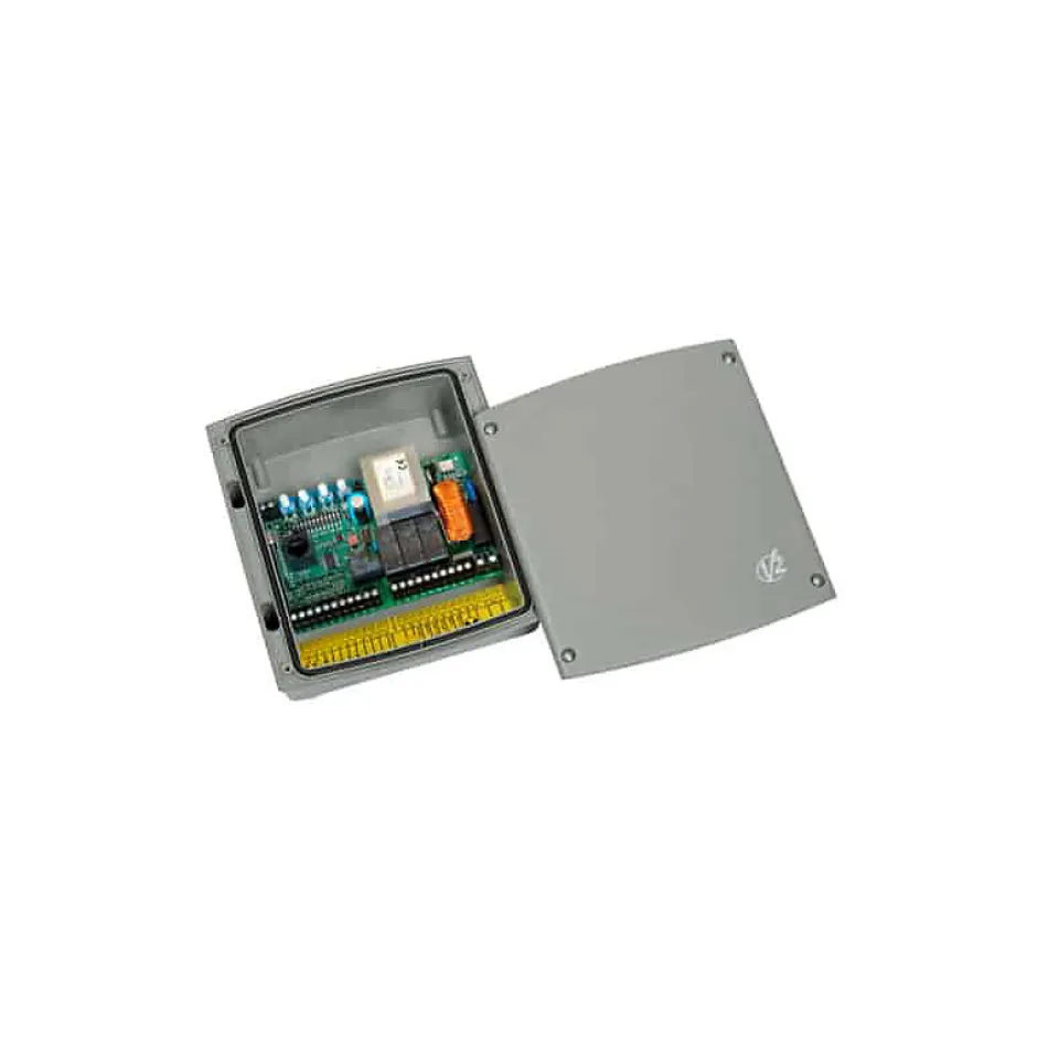 Armoire de Commande V2 FLEXY2 12G035. Paramétrage et programmation par bouton et voyant. Type d’alimentation 230v avec 2 moteurs monophasés. Il est fourni avec un radio-récepteur inclu 433,92 MHz. Mémorisation jusqu’à 240 télécommandes Personal-Pass 433,92 MHz. Connecteur “RJ45” pour branchement avec le programmateur PROG2 en utilisant un câble de réseau (UTP). Gestion de démarrage, démarrage piéton et arrêt