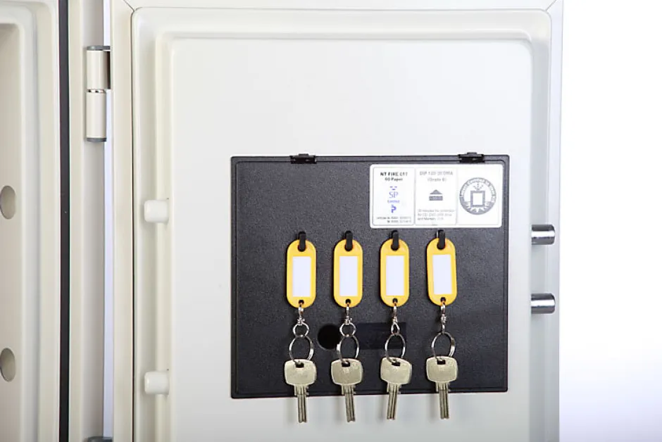 Armoire ignifuge pour la protection des supports papier.Serrure à clé double panneton.Haute protection contre le feu : 60 minutes dans des conditions d’exposition à une température constante de 1010°C.Serrure de haute sécurité certifiée A2P (marque KABA MAUER commercialisée sous la référence 71111 PRESIDENT A/E – classe A/E – certificat n°CM 19.88) avec fermeture par clé à double panneton.Blocage par pênes au niveau des pivots empêchant le démontage de la porte en cas d’attaque des paumelles.Tablette sur crémaillère réglable et amovible.Le modèle 40 S NGS a 2 trous de fixation à la base.Peinture RAL 9002Dimensions intérieures : H 41 x L 30 x P 30 cm