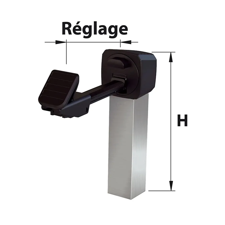 - Rotation du sabot à 360° tous les 15° à l’aide de la vis de transformation à l’arrière. Butée intégrée permettant d’amortir l’arrivée du portail. Sabot réglable pour réceptionner un profilé de 30 à 100 mm d’épaisseur. Réglage facile du sabot à l’aide du clips de verrouillage (possibilité de couper la tige de réglage). Notice disponible via le QrCode sur le sachet.