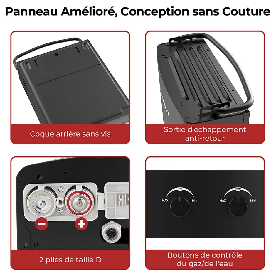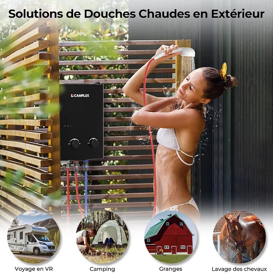 ➤ 5 l/min d’eau chaude instantanée – Camplux AY132B-DE fournit 5 litres par minute d’eau chaude sans fin en 8 secondes lorsque le pommeau de douche est allumé. Avec cette douche extérieure portable, vous pouvez profiter d’une douche chaude, donner à vos chevaux et animaux de compagnie un spa chaud confortable.➤ Protection multiple – Protection contre les pannes de flamme, protection contre la surchauffe, protection contre le manque d’oxygène pour assurer la sécurité de votre famille. La vis de vidange sert à drainer l’eau résiduelle de l’appareil pour éviter le gel ou la casse.➤ Économisez de l’énergie et de l’argent – Ce chauffe-eau à gaz 5L utilise une technologie d’économie d’énergie, une augmentation de la température plus élevée avec un coût égal de gaz. Contrairement au réservoir d’eau chaude, ce chauffe-eau instantané ne chauffe l’eau que dans la quantité dont vous avez besoin. Il n’a pas besoin d’être préchauffé, ce qui élimine le temps d’attente pour l’eau chaude.➤ Poignée pliable pour un transport facile – Cette douche à gaz ne pèse que 4,54 kg et dispose d’une poignée qui vous permet de la transporter facilement n’importe où. Il est livré avec la plupart des accessoires nécessaires pour une installation rapide. Le régulateur de gaz CE de 50 mbar est compatible avec n’importe quelle bouteille de gaz propane ou butane.➤ Facile à utiliser – vous pouvez facilement régler le débit d’eau et de gaz pour atteindre la température souhaitée. Plage de température de 10~65°C. Avec un démarrage de 0,25 bar, il est idéal pour les camping-cars, les camping-cars et les écuries à basse pression d’eau.