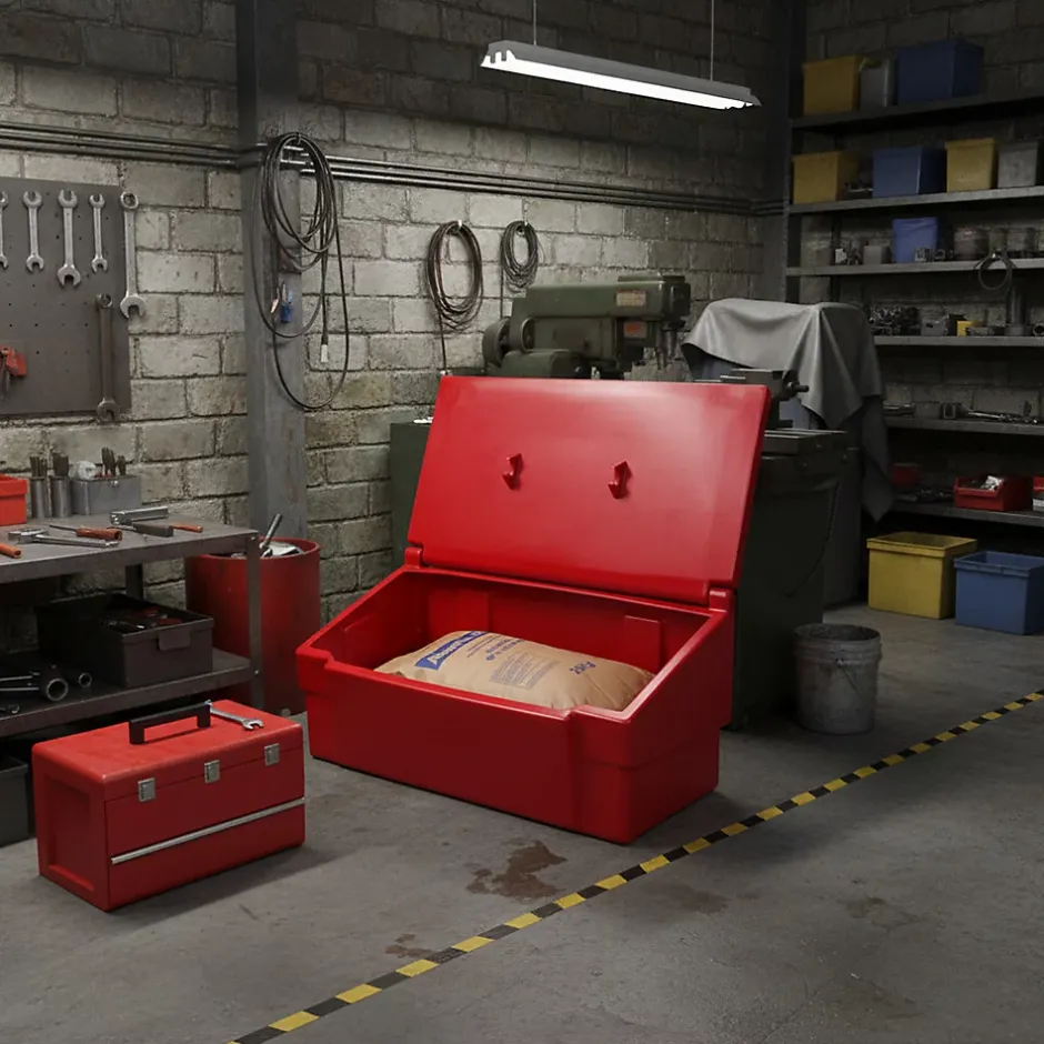 Bac à sable incendie/ à sel de déneigement avec pelle d’une capacité de 100L en polyéthylène haute densité traité anti UV, très résistant.Des clips intégrés dans le couvercle permettent de fixer une pelle (pelle non fournie).Couvercle pentu.Lot de 10 bacs à sable. Capacité : 100LLongueur : 98 cmHauteur : 45 cmLargeur : 50 cmPoids : 10.5 kgCouvercle pentuPour stockageMatière : polyéthylène haute densitéTrès résistant aux chocsPlage d’utilisation : -30°C à +60°C100% recyclableMarque : Plast’Up RotomoulageFabrication Française