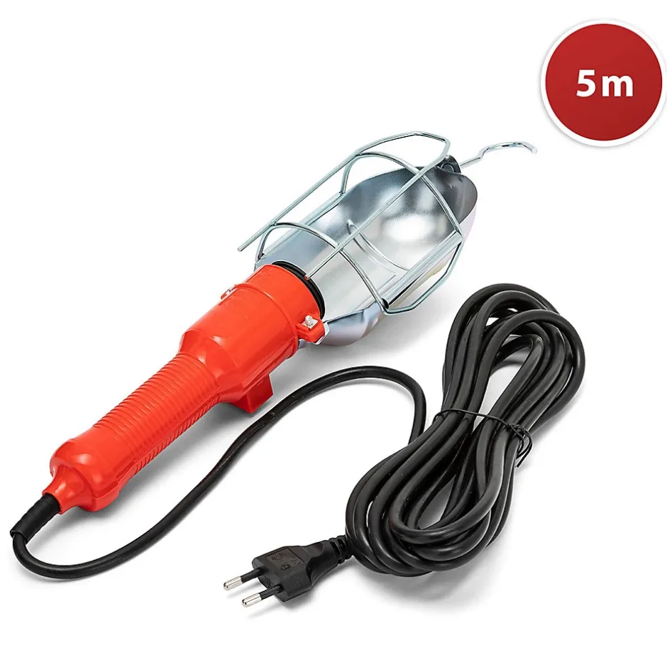 Baladeuse: lampe de travail portable pour une utilisation dans le garage, la cave, l’atelier, le chantier avec interrupteur et câble de 5 mètres (h05vv-f 2×0,75mm2, PVC). Culot E27 pour 1 ampoule max 60W (non incluse). Compatible LED. Équipée d’un crochet réglable à 360° pour accrocher le produit de partout. Fiche 6A française. Cage métallique hyper résistante aux chocs