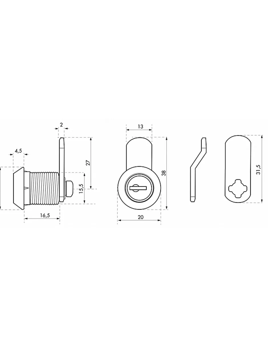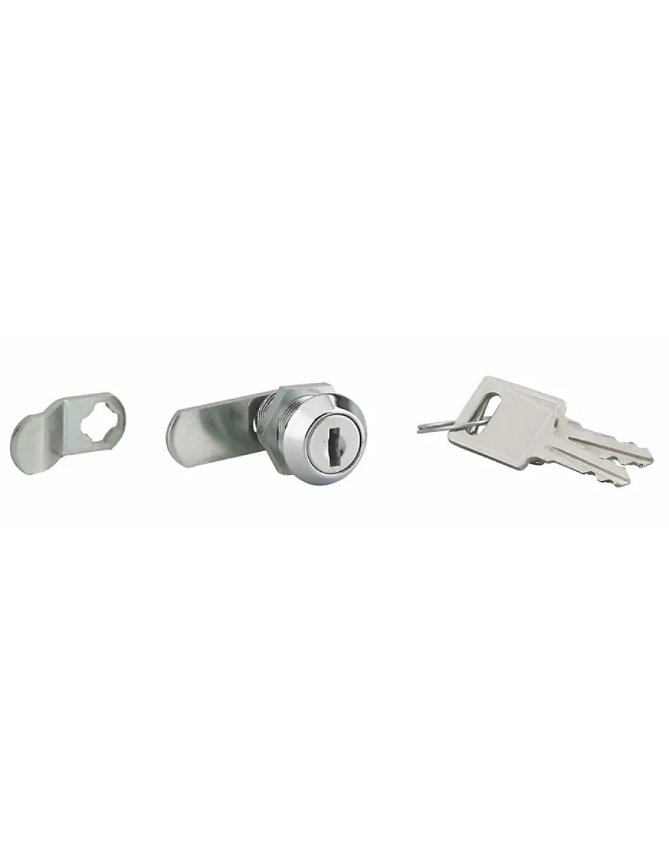 Corps alliage moulé. Mécanisme à paillettes. 1 came plate + 1 came coudée. 2 clés nickelées. Ecrou de fixation.