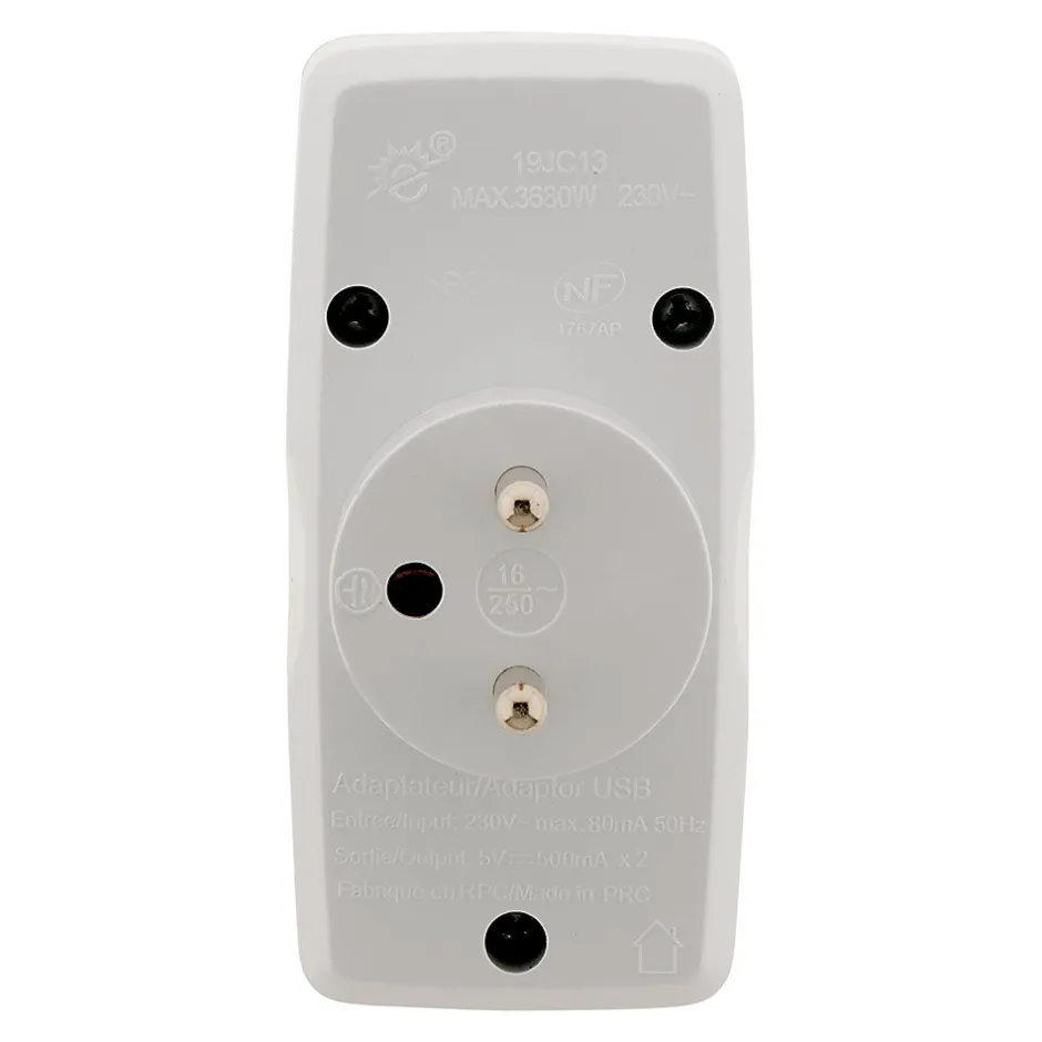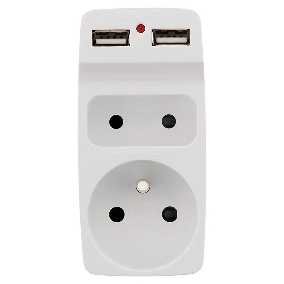Multiprise biplite + USB. Couleur(s) : blanc. 1 prise 2P 6A standard + 1 prise 2P+T 16A (terre) pour appareils puissants. Double port USB (2 sorties). Charge simultanée : 2.4A max. Compatible QC3.0 (charge rapide). Indicateur lumineux de mise sous tension. Anti-surcharge, surtension et protection contre les courts-circuits. Dimensions compactes : 10 x 6 x 4 cm. Normes CE + RoHS