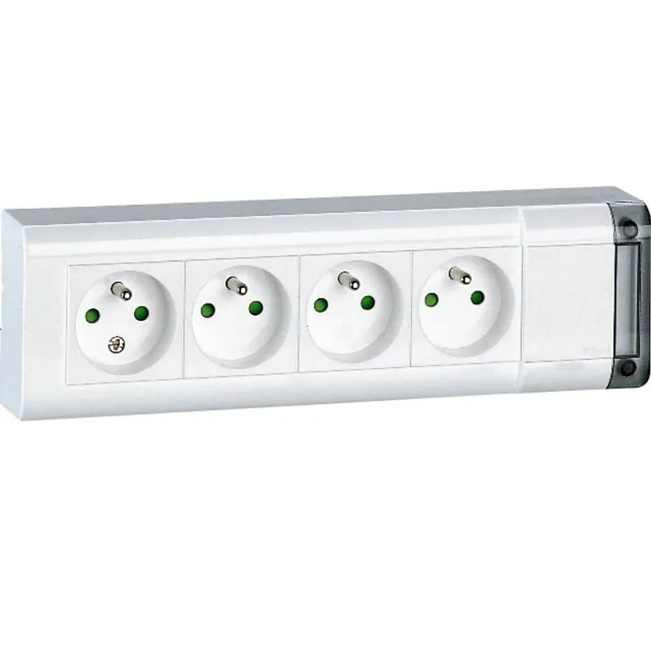 Multiprise 4 ou 6 prises. Couleur(s) : blanc. Équipée de 4 ou 6 prises 2P+T. Intensité : 16A. Tension : 230V. Puissance : 3500W. Fixation murale possible. Multiprise à câbler (câble souple 3G 1,5mm²). Avec éclips de protection et embout porte-étiquette. Indice de protection : IP20/IK08. Norme(s) : NF. Livrée avec 3 embouts spéciaux pour association avec moulure : 20 x 12,5 mm, 32 x 12,5 mm, 32 x 16 mm, 32 x 20 mm ou tube Ø16/20mm