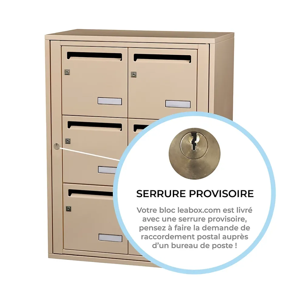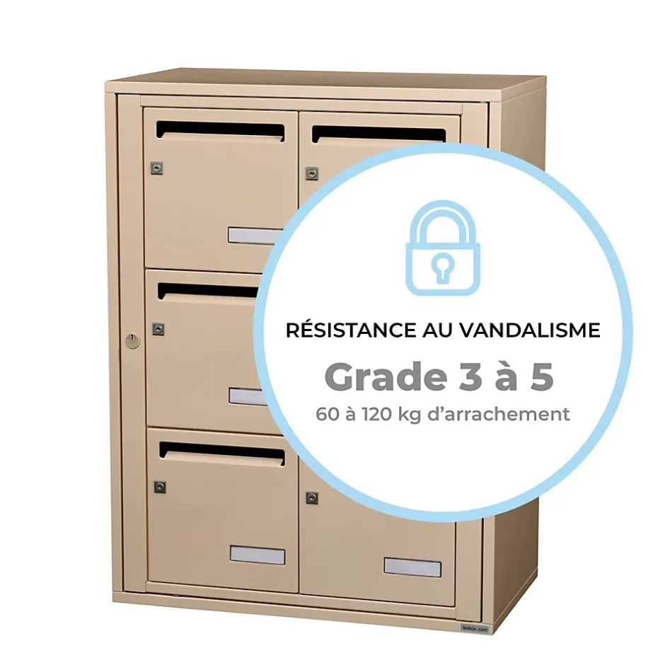 Bloc de boites aux lettres collectives, intérieur, mural, normalisé, certifié loi handicap, à ouverture totale, conforme à la norme NF D27-404, antivandalisme grade 3. En tôle d’acier galvanisé, garantie anticorrosion 10 ans. Dimensions : 710x944x387mm. Portillons jointifs pour un gain de place. Fermeture par serrure en zamak, came renforcée. Portillons avec volet embouti interchangeable, fente d’introduction avec herse antivol intégrée. Coffre et cloisons rigides, rivetés sans soudureDisposition : 2 boites en largeur et 3 boites en hauteur. Peinture poudre polyester sans plomb. Porte nom affleurant en polycarbonate, dimensions 103x28mm. Tableau de clés fourni à l’intérieur du bloc, 2 clés fournies par boite. Le bloc de boites aux lettres est livré avec une serrure en laiton poli provisoire : ce système sert à maintenir le bloc fermé durant le transport et la pose. Il est obligatoire de le remplacer par une serrure définitive normalisée, fournie gratuitement par La Poste. Pour un immeuble neuf, la demande de raccordement postal est à faire après du bureau de poste local. En cas de rénovation, il suffit de récupérer la serrure normalisée La Poste installée sur le bloc remplacé. Bon à savoir : il existe 19 Pass La Poste différents, variables d’un quartier à un autre, selon la tournée du facteur.