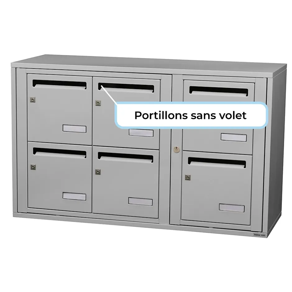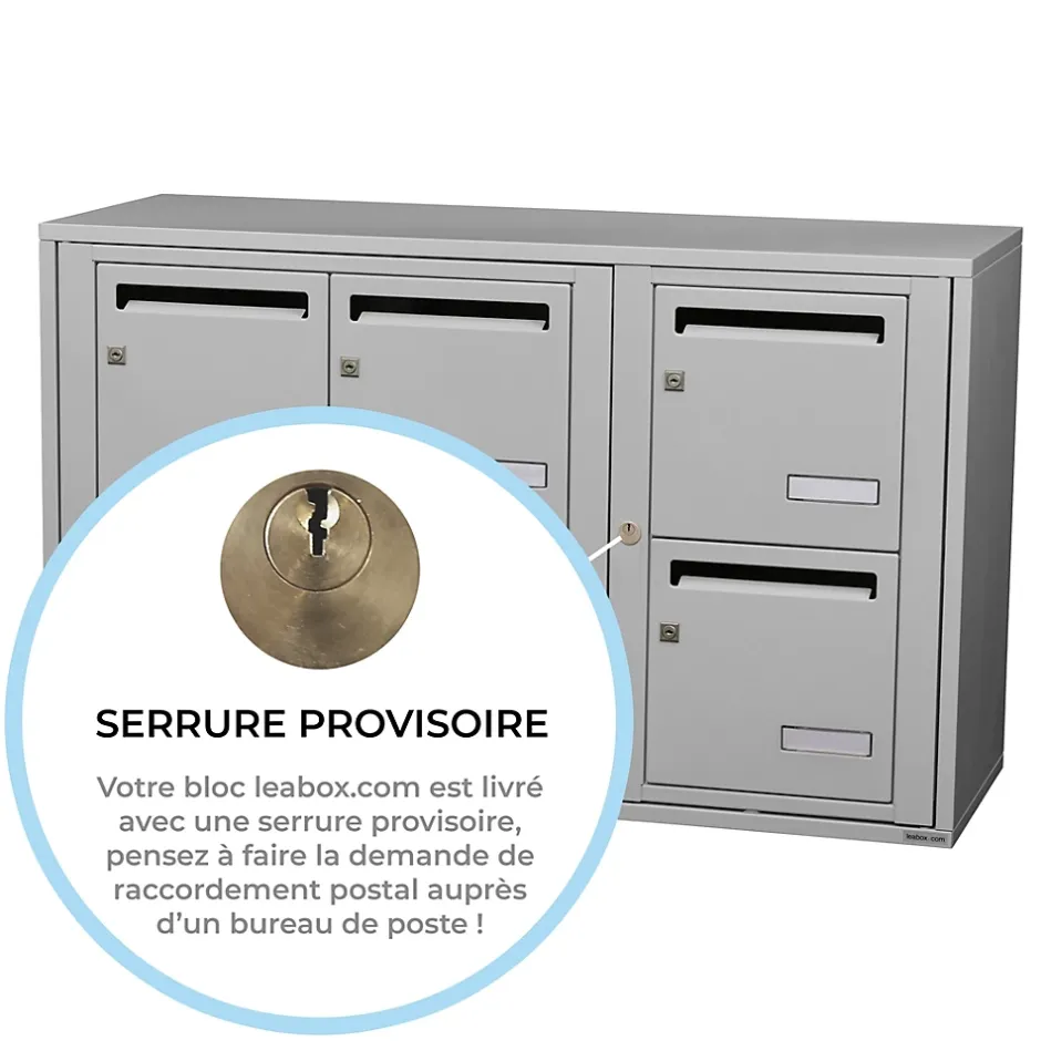 Bloc de boites aux lettres collectives, intérieur, mural, normalisé, certifié loi handicap, à ouverture totale, conforme à la norme NF D27-404, antivandalisme grade 3. En tôle d’acier galvanisé, garantie anticorrosion 10 ans. Dimensions : 1090x659x387mm. Portillons jointifs pour un gain de place. Fermeture par serrure en zamak, came renforcée. Portillons avec volet embouti interchangeable, fente d’introduction avec herse antivol intégrée. Coffre et cloisons rigides, rivetés sans soudureDisposition : 3 boites en largeur et 2 boites en hauteur. Peinture poudre polyester sans plomb. Porte nom affleurant en polycarbonate, dimensions 103x28mm. Tableau de clés fourni à l’intérieur du bloc, 2 clés fournies par boite. Le bloc de boites aux lettres est livré avec une serrure en laiton poli provisoire : ce système sert à maintenir le bloc fermé durant le transport et la pose. Il est obligatoire de le remplacer par une serrure définitive normalisée, fournie gratuitement par La Poste. Pour un immeuble neuf, la demande de raccordement postal est à faire après du bureau de poste local. En cas de rénovation, il suffit de récupérer la serrure normalisée La Poste installée sur le bloc remplacé. Bon à savoir : il existe 19 Pass La Poste différents, variables d’un quartier à un autre, selon la tournée du facteur.