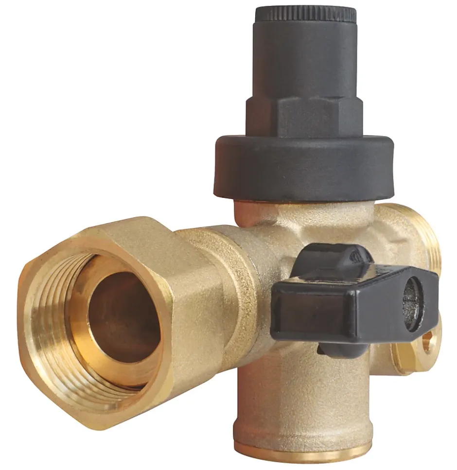 SOMATHERM FOR YOU – Bloc réducteur 3-en-1 – Corps en laiton nickelé – Ecrou tournant-Mâle 20/27 – Intégrant 1 Réducteur à piston + 1 Clapet anti-retour NF + 1 Vanne
