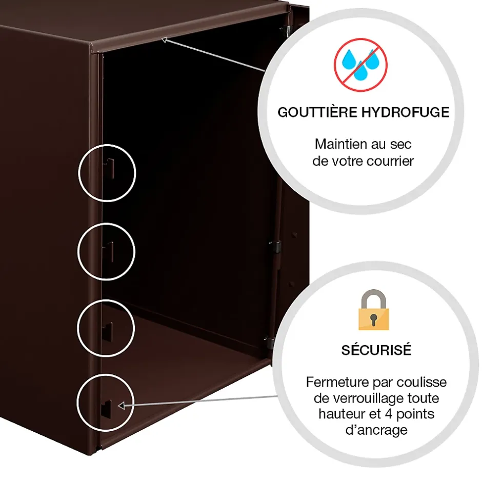 Produit sur-mesure : ce produit spécial est fabriqué à la commande. Boite à colis Atout, conçue pour répondre à tous vos besoins en matière de livraison sécurisée. Grâce à son volume optimisé, elle peut accueillir jusqu’à 70% des colis du e-commerce, pour vous permettre de réceptionner tous vos colis, même volumineux, directement à domicile, en toute tranquillité. Boite aux lettres et à colis normalisée 1 porte Renz. Corps en acier revêtu permettant de réceptionner votre courrier et vos colis volumineux. Volume optimisé : permet de recevoir jusqu’à 70% des colis du e-commerce. Système de fermeture sécurisé par coulisse de verrouillage toute hauteur à 4 points d’ancrage, résistante à 120 kg d’arrachement. Pose facile. Boitier avec gouttière hydrofuge. Porte recouvrante en acier bi-métal avec un décor pointes de diamant équipée d’un volet aluminium et d’un porte-nom affleurant en polycarbonate. Serrure normalisée. Fixation murale, sur pied latéral, sur muret, ou en encastrement. Peinture poudre polyester sans plomb. Garantie anti-corrosion de 15 ans. Certifiée loi handicap. Dimensions intérieures (volume utile pour la réception de colis) : 327x476x362 – Dimensions extérieures : 370x500x400mm.Boite à colis avec un volume optimisé. Permet de recevoir jusqu’à 70% des colis du e-commerce. Garantie anti-corrosion de 15 ans. Système de fermeture sécurisé par coulisse de verrouillage toute hauteur à 4 points d’ancrage, résistante à 120 kg d’arrachement. Pose facile. Porte recouvrante en acier bi-métal avec un décor pointes de diamant équipée d’un volet aluminium.Photos non contractuelles, se référer au RAL pour le coloris.