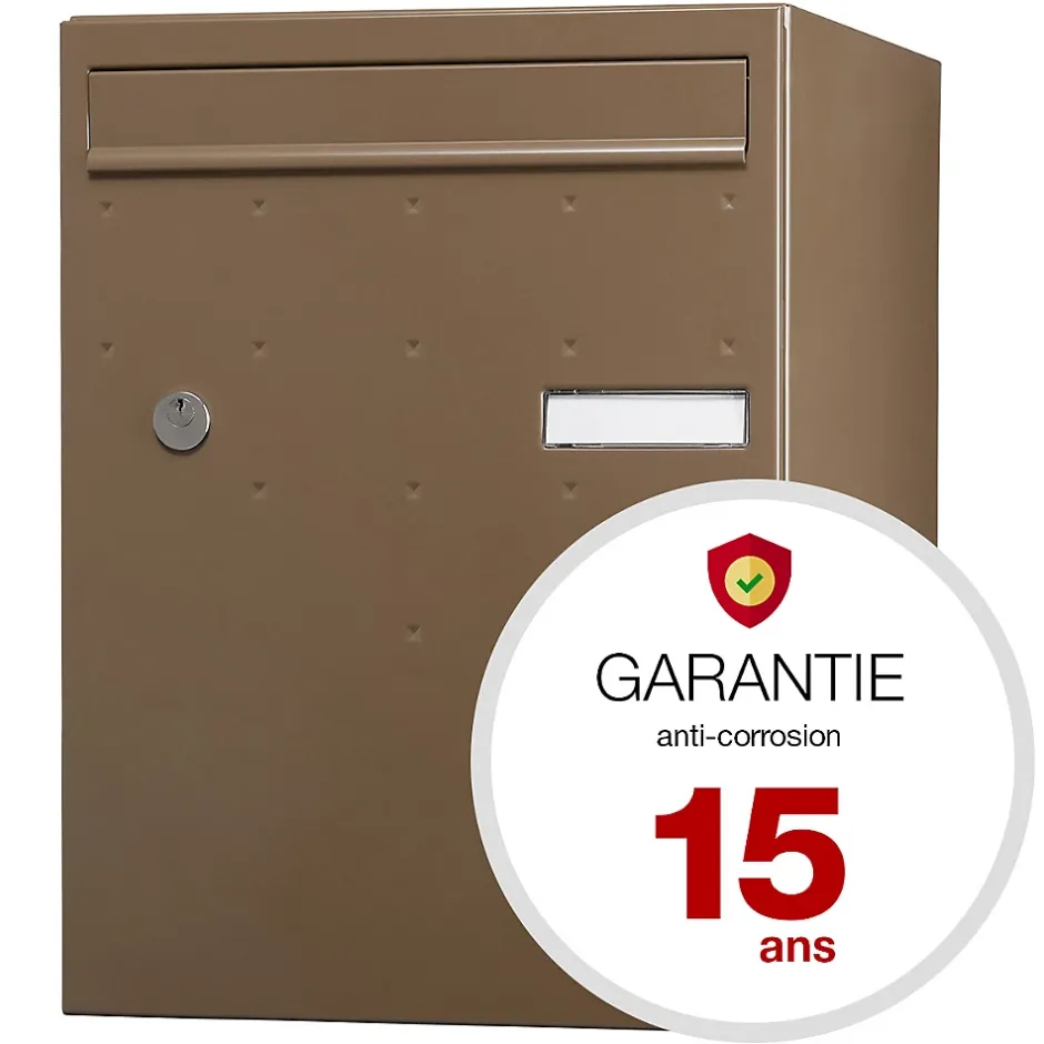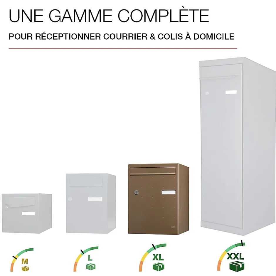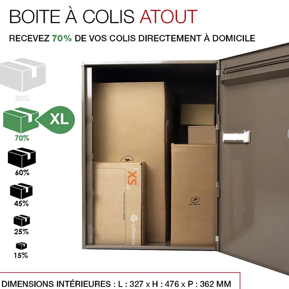 Produit sur-mesure : ce produit spécial est fabriqué à la commande. Boite à colis Atout, conçue pour répondre à tous vos besoins en matière de livraison sécurisée. Grâce à son volume optimisé, elle peut accueillir jusqu’à 70% des colis du e-commerce, pour vous permettre de réceptionner tous vos colis, même volumineux, directement à domicile, en toute tranquillité. Boite aux lettres et à colis normalisée 1 porte Renz. Corps en acier revêtu permettant de réceptionner votre courrier et vos colis volumineux. Volume optimisé : permet de recevoir jusqu’à 70% des colis du e-commerce. Système de fermeture sécurisé par coulisse de verrouillage toute hauteur à 4 points d’ancrage, résistante à 120 kg d’arrachement. Pose facile. Boitier avec gouttière hydrofuge. Porte recouvrante en acier bi-métal avec un décor pointes de diamant équipée d’un volet aluminium et d’un porte-nom affleurant en polycarbonate. Serrure normalisée. Fixation murale, sur pied latéral, sur muret, ou en encastrement. Peinture poudre polyester sans plomb. Garantie anti-corrosion de 15 ans. Certifiée loi handicap. Dimensions intérieures (volume utile pour la réception de colis) : 327x476x362 – Dimensions extérieures : 370x500x400mm.Boite à colis avec un volume optimisé. Permet de recevoir jusqu’à 70% des colis du e-commerce. Garantie anti-corrosion de 15 ans. Système de fermeture sécurisé par coulisse de verrouillage toute hauteur à 4 points d’ancrage, résistante à 120 kg d’arrachement. Pose facile. Porte recouvrante en acier bi-métal avec un décor pointes de diamant équipée d’un volet aluminium.Photos non contractuelles, se référer au RAL pour le coloris.