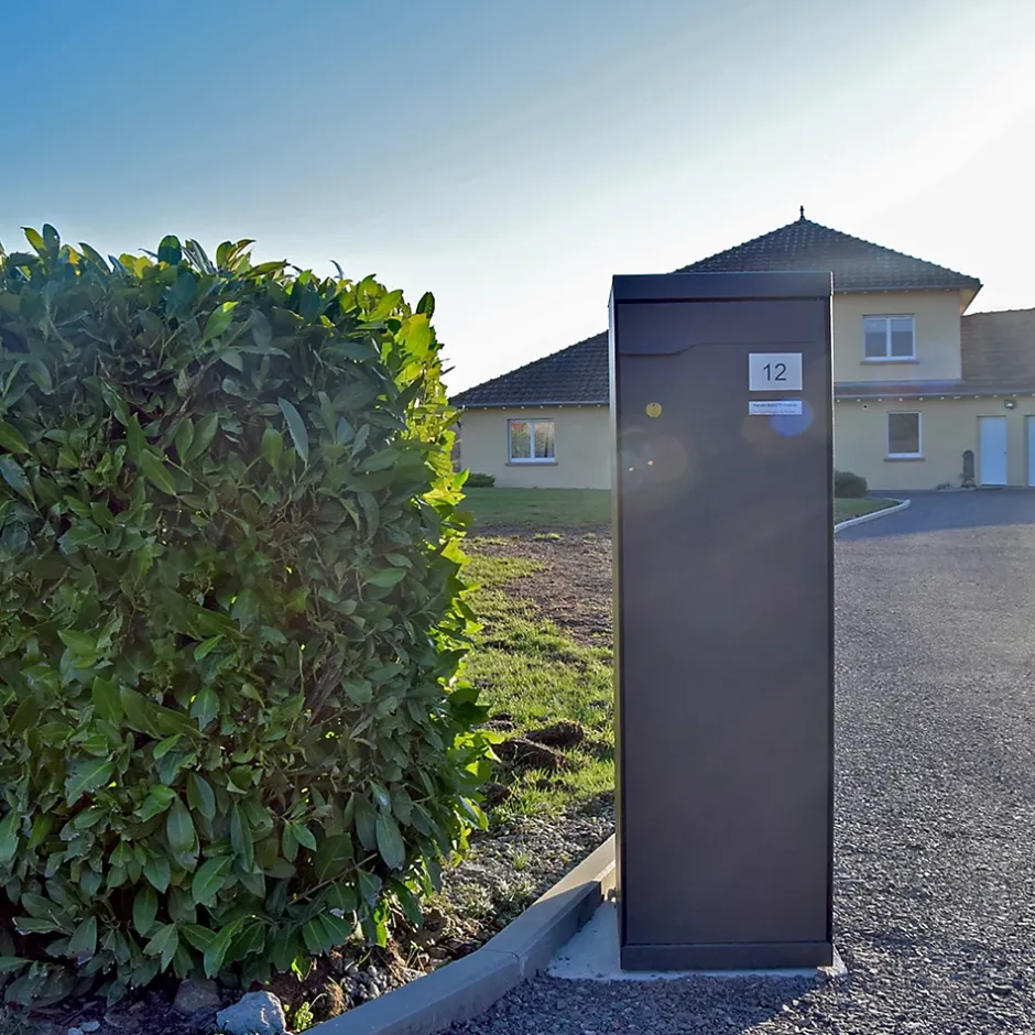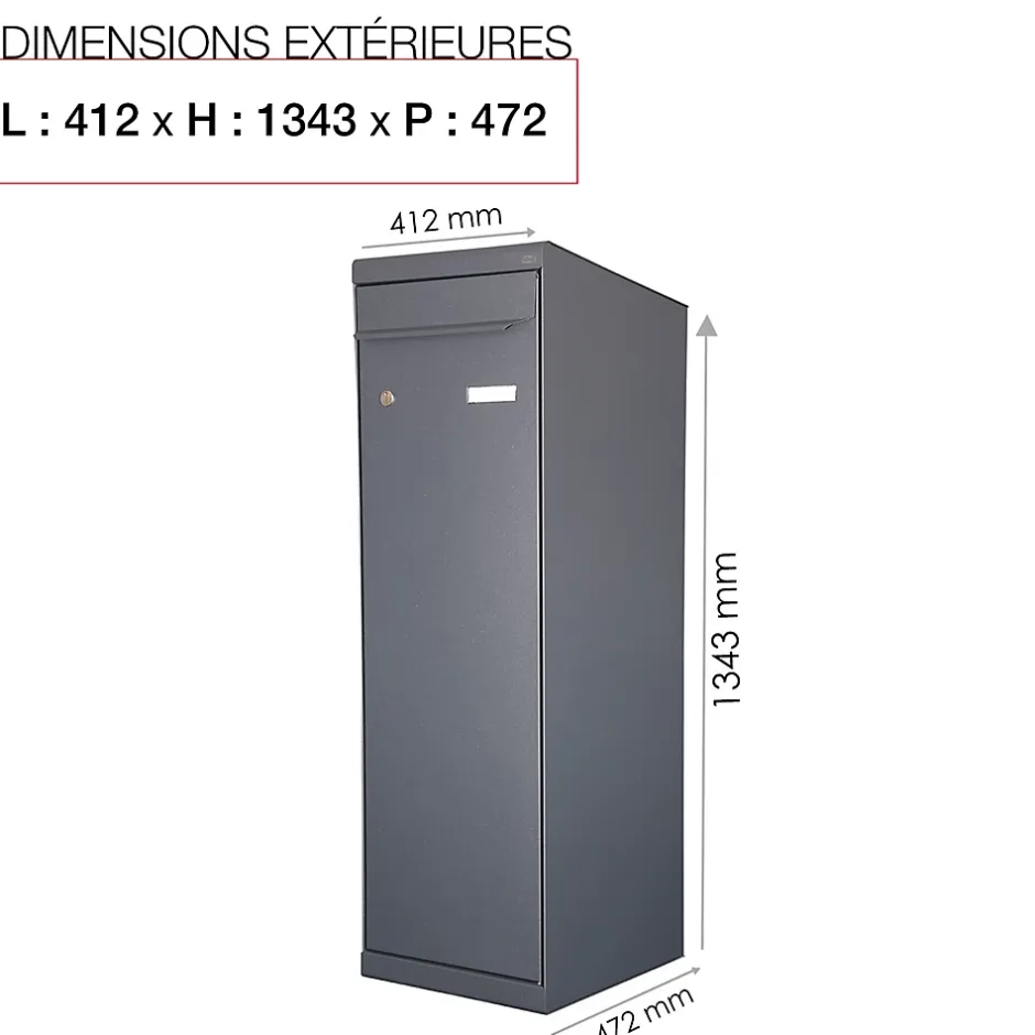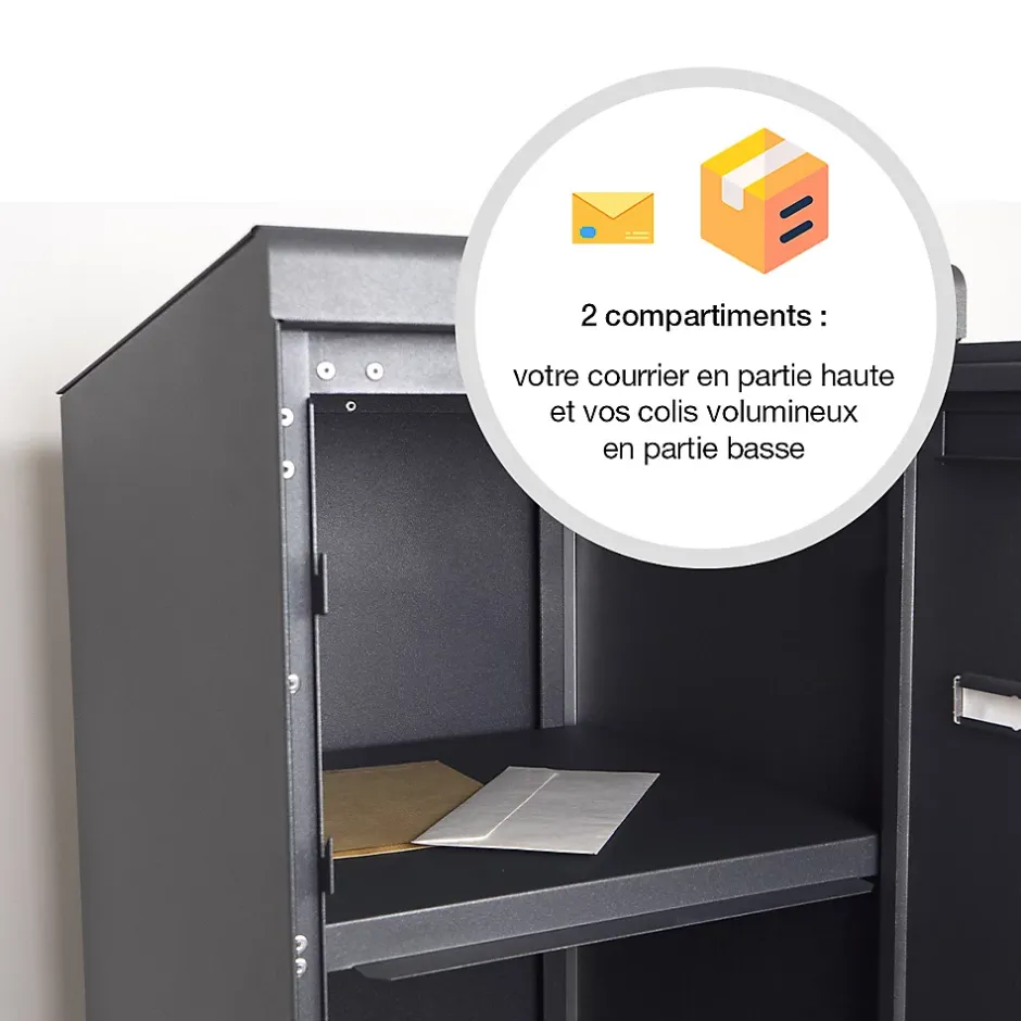 Produit sur-mesure : ce produit spécial est fabriqué à la commande. Boite aux lettres et à colis Twin XL, normalisée. Corps en acier revêtu avec 2 compartiments permettant de recevoir votre courrier en partie haute et vos colis volumineux en partie basse. Pour recevoir tous vos colis, même volumineux à domicile sans se déplacer : de recevoir plus de 80% des colis issus du e-commerce. Sécurité renforcée, grâce à un système de fermeture par coulisse de verrouillage à 8 points d’ancrage, résistante à 150 kg d’arrachement. Porte en acier revêtu bi-métal, équipée d’une serrure normalisée et d’un volet doté de butées anti-bruit. Fond pré percé, facilitant la mise en place des accessoires de pose spécialement adaptés. Fixation muralee, au sol ou en encastrement. Dimensions intérieures (partie haute) : 340 x 265 x 404 mm – (partie basse) : 340 x 885 x 404 mm. Dimensions extérieures : 412 x 1343 x 472 mm.Boite à colis ingénieuse pour recevoir 80% des colis issus du e-commerce. Corps en acier revêtu avec 2 compartiments permettant de recevoir votre courrier en partie haute et vos colis volumineux en partie basse. Garantie anti-corrosion de 15 ans. Sécurité renforcée, grâce à un système de fermeture par coulisse de verrouillage à 8 points d’ancrage, résistante à 150 kg d’arrachement. Équipée d’une serrure normalisée et d’un volet doté de butées anti-bruit.Photos non contractuelles, se référer au RAL pour le coloris.