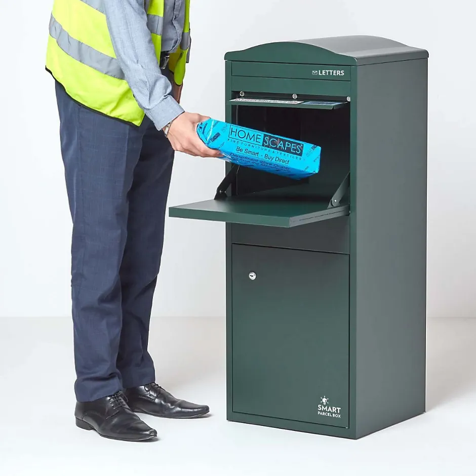 Recevez vos livraisons en toute sérénité avec la SMART PARCEL BOX™ grand format, une boîte à colis extérieure sécurisée conçue pour recevoir plusieurs colis par jour, même en votre absence. Haute de 104 cm, cette boîte aux lettres sur pied possède un compartiment supérieur pratique où les livreurs peuvent déposer vos colis et scanner un code-barres unique comme preuve de livraison. Pour amortir la chute des colis, une couche de PVC protectrice est intégrée à l’intérieur. Une fois déposés, vos colis restent en sécurité dans le compartiment inférieur, accessible uniquement grâce à votre clé personnelle. Fabriquée en acier galvanisé avec revêtement anti-rouille, cette boîte aux lettres résistante aux intempéries s’installe facilement devant votre maison. Les fixations sont incluses (vérifiez la compatibilité selon votre type de mur ou sol). Pratique, robuste et antivol, elle vous permet de recevoir vos colis en toute sécurité à tout moment, même lorsque vous êtes absent.