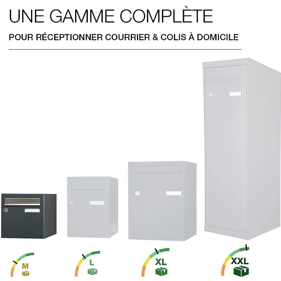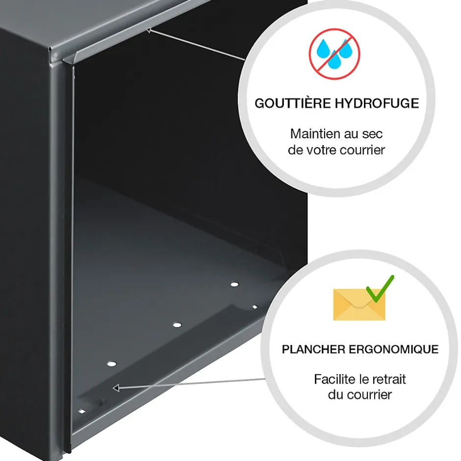 Boite aux lettres normalisée 1 porte Renz Allure, design épuré. Permet de recevoir jusqu’à 45% des colis du e-commerce. Boitier avec gouttière hydrofuge, porte recouvrante équipée d’un volet en inox structuré amorti pour un meilleur confort acoustique, et d’un porte-nom affleurant en polycarbonate. Serrure normalisée avec 2 clés. Plancher ergonomique pour un retrait facile du courrier. Peinture poudre polyester sans plomb. Garantie anti-corrosion de 15 ans. Anti-vandale grade 3, résistant jusqu’à 60 kg d’arrachement. Certifiée loi handicap. Dimensions : 285x285x385mm.Apportez une touche d’élégance devant votre maison : optez pour la boite aux lettres Allure 1 porte, au design épuré et moderne. Allure est dotée d’un volet en inox structuré et amorti, qui permet d’offrir un bon confort acoustique. Sa gouttière hydrofuge permet de protéger efficacement votre courrier et vos colis même en cas de fortes pluies. Normalisée, la boite aux lettres Allure permet de réceptionner jusqu’à 45% des colis issus du e-commerce, directement chez vous. Elle dispose également d’un plancher ergonomique pour faciliter le retrait du courrier.Photos non contractuelles, se référer au RAL pour le coloris.