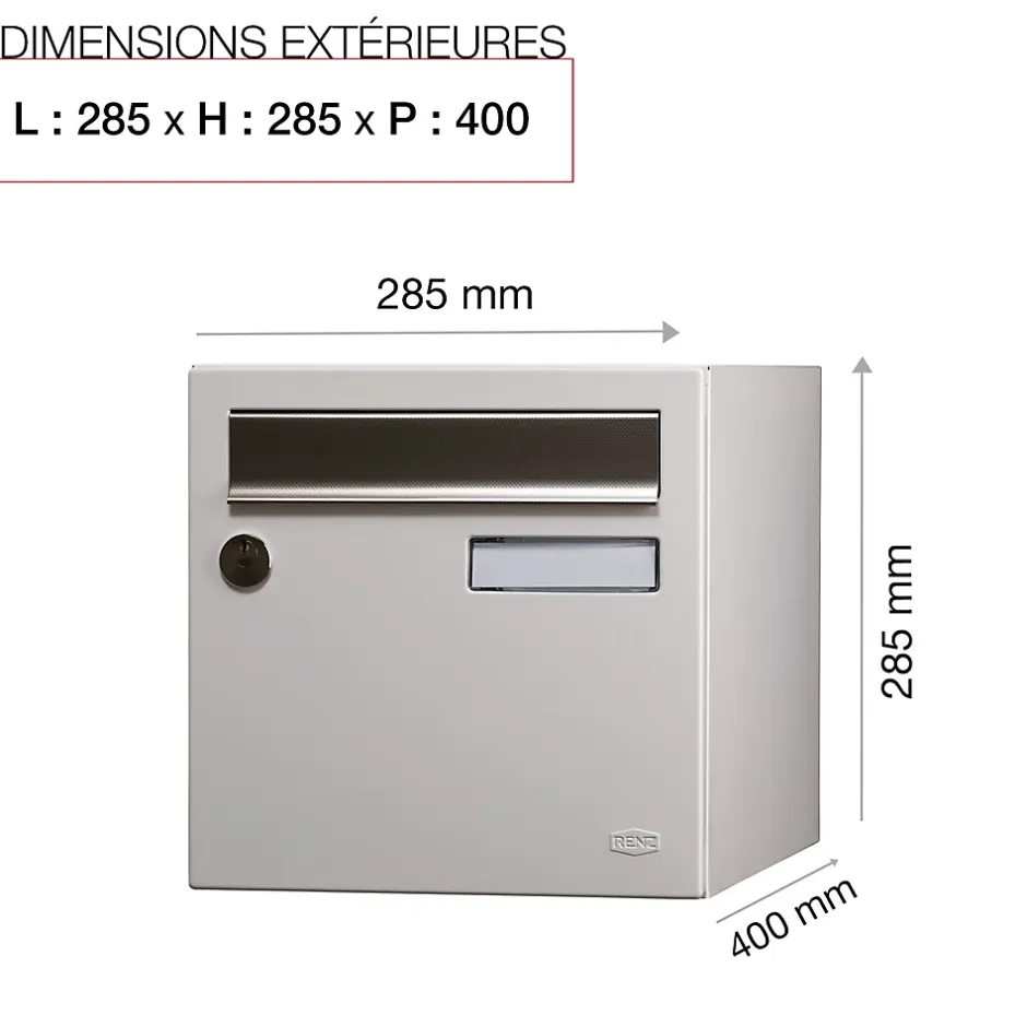 Produit sur-mesure : ce produit spécial est fabriqué à la commande. Boite aux lettres normalisée 2 portes Renz Allure, design épuré. Permet de recevoir jusqu’à 45% des colis du e-commerce. Boitier avec gouttière hydrofuge, porte recouvrante équipée d’un volet en inox structuré amorti pour un meilleur confort acoustique, et d’un porte-nom affleurant en polycarbonate. Serrure normalisée avec 2 clés. Plancher ergonomique pour un retrait facile du courrier. Peinture poudre polyester sans plomb. Garantie anti-corrosion de 15 ans. Anti-vandale grade 3, résistant jusqu’à 60 kg d’arrachement. Certifiée loi handicap. Dimensions : 285x285x400mm.Apportez une touche d’élégance devant votre maison : optez pour la boite aux lettres Allure 2 portes, au design épuré et moderne. Allure est dotée d’un volet en inox structuré et amorti, qui permet d’offrir un bon confort acoustique. Le modèle 2 portes d’Allure possède une ouverture à l’avant ainsi qu’à l’arrière. Cela permet de récupérer son courrier et ses colis depuis l’intérieur de sa résidence, si la boite est encastrée dans un mur par exemple. Sa gouttière hydrofuge permet de protéger efficacement votre courrier et vos colis même en cas de fortes pluies. Normalisée, la boite aux lettres Allure permet de réceptionner jusqu’à 45% des colis issus du e-commerce, directement chez vous. Elle dispose également d’un plancher ergonomique pour faciliter le retrait du courrier.Photos non contractuelles, se référer au RAL pour le coloris.