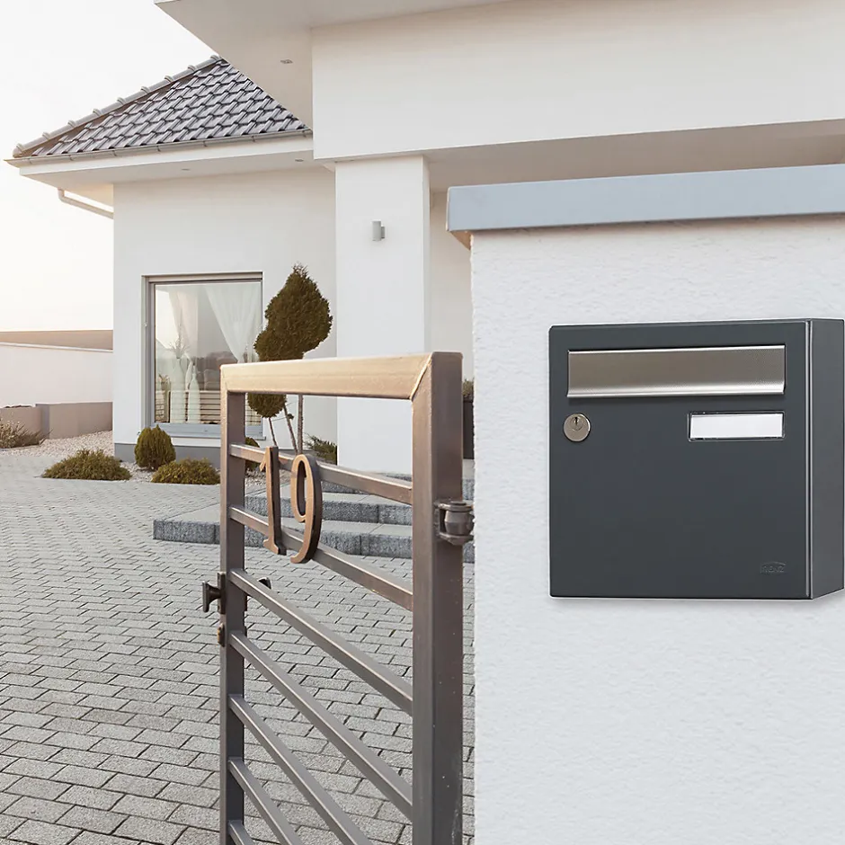 Boite aux lettres compacte Renz Allure au design épuré. Boitier avec gouttière hydrofuge. Porte recouvrante équipée d’un volet en inox structuré amorti pour un meilleur confort acoustique et du porte-nom affleurant en polycarbonate. Serrure normalisée avec 2 clés. Peinture poudre polyester sans plomb. Garantie anti-corrosion de 15 ans. Anti-vandale grade 2. Dimensions : 285x285x150mm.Vous recherchez une boite aux lettres élégante et compact pour une pose en bord de rue ? Allure compact est faite pour vous ! Elle est dotée d’un volet en inox structuré et amorti pour un confort acoustique optimal et un design sobre et élégant, pour une parfaite intégration à votre extérieur. Pour garantir un courrier et des colis au sec, même en cas de fortes pluie, Allure dispose d’une gouttière hydrofuge. Son plancher ergonomique vous facilitera le retrait de votre courrier.Photos non contractuelles, se référer au RAL pour le coloris.