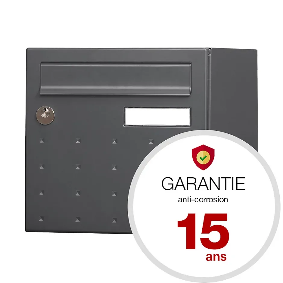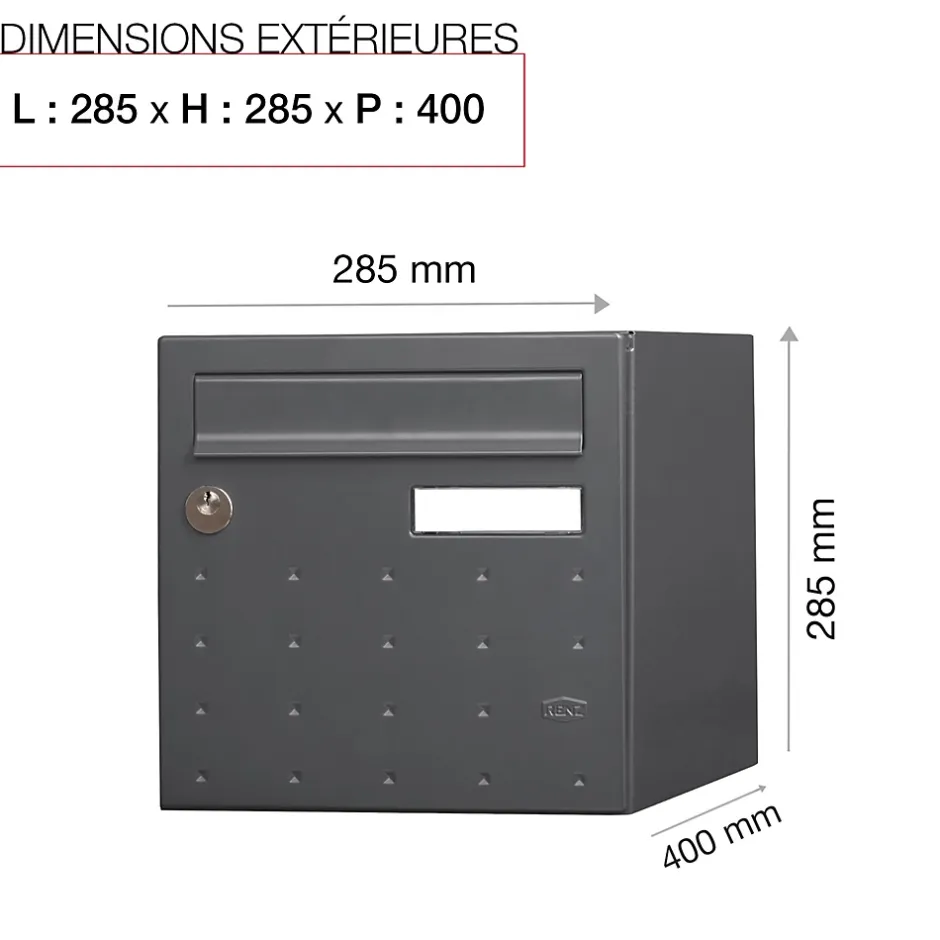 Produit sur-mesure : ce produit spécial est fabriqué à la commande. Boite aux lettres normalisée 2 portes Renz CubYsm avec décor. Permet de recevoir jusqu’à 45% des colis du e-commerce. Boitier avec gouttière hydrofuge permettant de maintenir le courrier au sec. Porte recouvrante équipée d’un volet acier avec atténuation de bruit pour un meilleur confort acoustique et d’un porte-nom affleurant en polycarbonate. Serrure normalisée avec 2 clés. Porte-arrière pour récupération du courrier et des colis, serrure non-normalisée avec 2 clés. Plancher ergonomique pour un retrait facile du courrier. Peinture poudre polyester sans plomb. Garantie anti-corrosion de 15 ans. Anti-vandale grade 3, résistant jusqu’à 60 kg d’arrachement. Certifiée loi handicap. Dimensions : 285x285x400mmLa boite aux lettres CubYsm bénéficie d’un design moderne en pointe de diamant. Pour protéger efficacement votre courrier contre les intempéries, elle dispose d’une gouttière hydrofuge et d’une porte recouvrante avec un volet. Ce dernier est amorti pour un meilleur confort acoustique à son ouverture et à sa fermeture. CubYsm est normalisée est permet de réceptionner votre courrier et des petits & moyens colis. De plus, son plancher ergonomique facilite le retrait du courrier.Elle possède aussi à l’arrière une seconde porte qui vous permettra de récupérer rapidement vos lettres et colis.Photos non contractuelles, se référer au RAL pour le coloris.