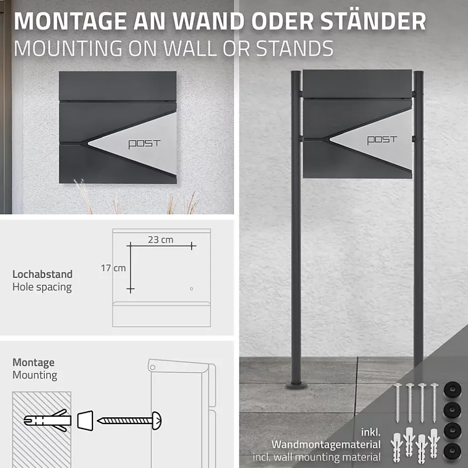 Description du produit :Ces boîtes aux lettres de ML-Design en acier inoxydable robuste et revêtu par poudre convainquent par leur design moderne et protègent ton courrier de manière fiable contre l’humidité et la saleté. Le revêtement de haute qualité est particulièrement durable et facile à entretenir et te garantit une utilisation sans problème.Le grand casier à courrier, que tu peux fermer en toute sécurité à l’aide des deux clés fournies, est particulièrement pratique. D’autres avantages sont le rouleau à journaux intégré ainsi que la grande ouverture d’introduction.Contenu de la livraison :1 x boîte aux lettres de ML-Design2 x clésmatériel de montage inclus