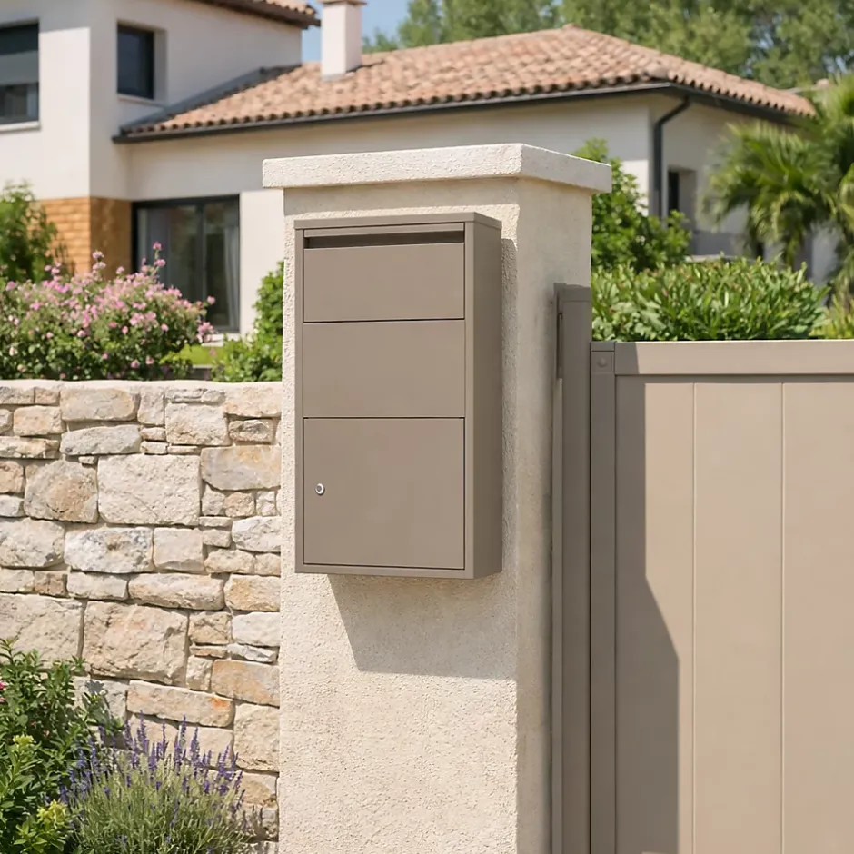 Une boîte aux lettres murale taupe élégante et solide, parfaite pour recevoir votre courrier en toute sécurité. Sa double ouverture et sa structure durable offrent un confort d’usage au quotidien.